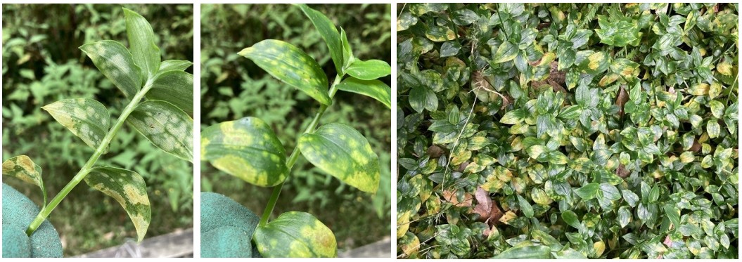 Left: Smut spores form on the lower surface of the leaf. Centre: Yellow dying cells from upper surface. Right: Infected area. Leaves will die, the plant will collapse, native vegetation can get light. Bush regenerators and gardeners, rejoice!