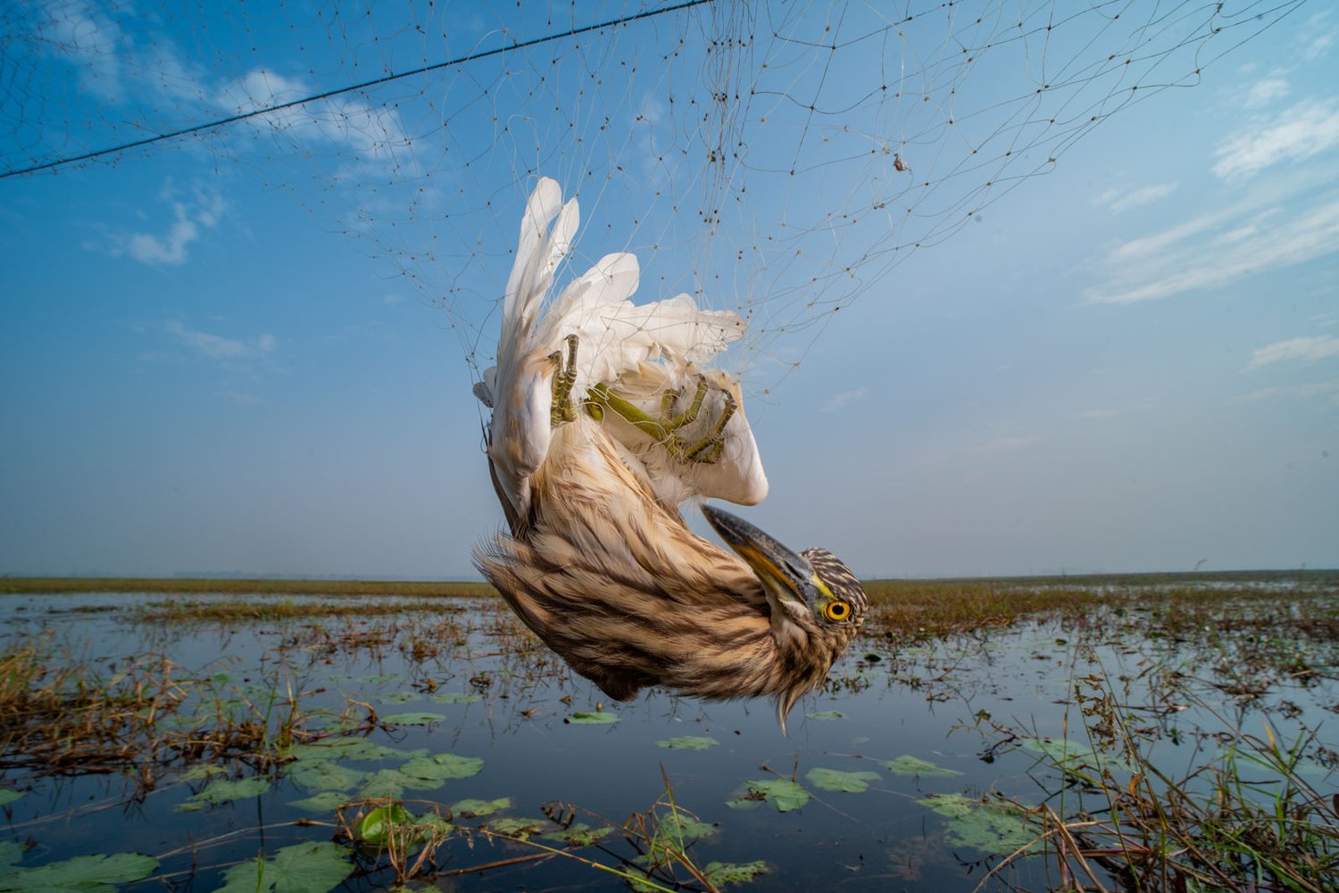 "The purple heron is a migratory bird that nests in the lake basins of the Italian Peninsula and feeds mainly on fish, although it also preys on mice, snakes, toads and other creatures. In this shot, the heron caught a large crucian carp (Carassius carassius) and voraciously swallowed it after several attempts to turn the fish onto its side."(©Antonio Aguti/Bird Photographer of the Year)