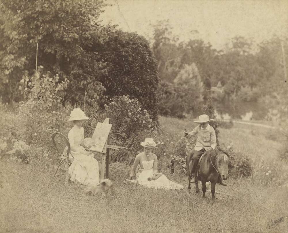 Peince. (1887). Ellis Rowan sketching Mary Moule sitting on the ground Retrieved from http://nla.gov.au/nla.obj-136503457 Image shows Ellis Rowan painting at her easel with Mary Moule sitting on the ground reading a book and Eric Rowan riding a pony. Inscriptions: "To Miss Moule with compliments Feb' 7 1887"--Verso centre; "Eric (Puck) Rowan on pony"--Verso lower centre; Signed "Peince"--Lower right corner.