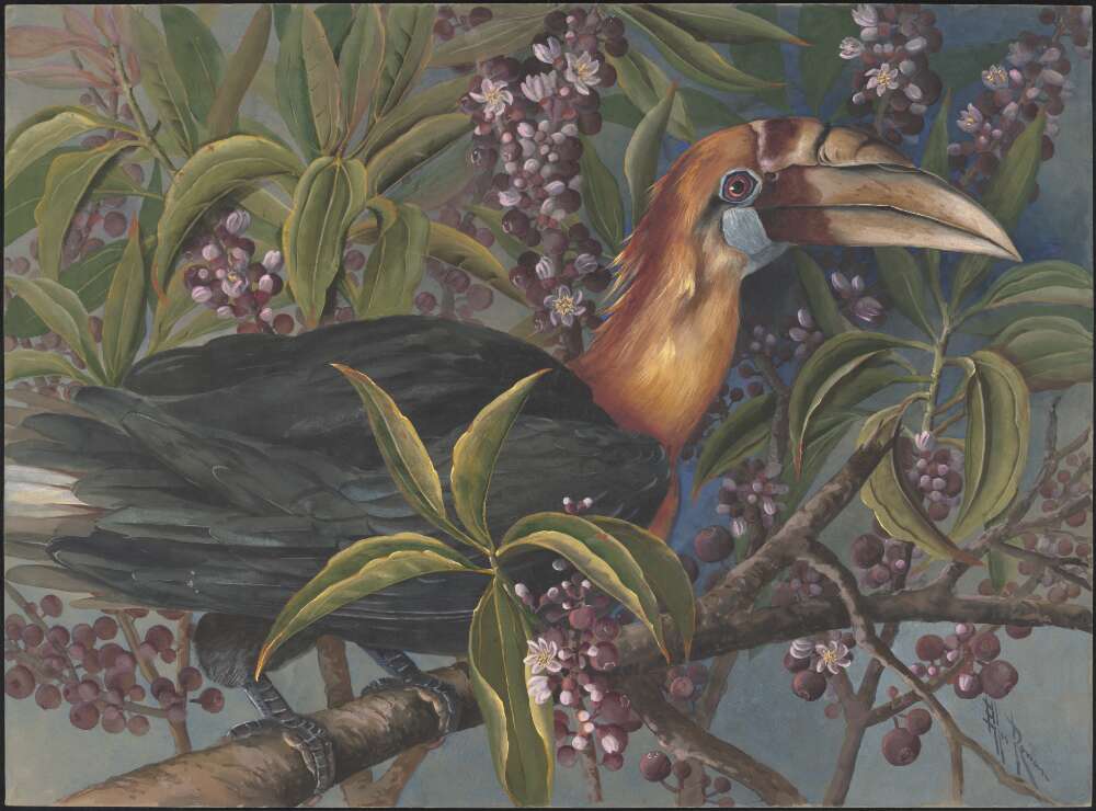 Rowan, Ellis. (1917). Hornbill, family Bucerotidae, perched in Pachygone ovata (Poir.) Miers ex Hook.f. & Thomson, family Menispermaceae, Papua New Guinea, 1917 Retrieved from http://nla.gov.au/nla.obj-138744013