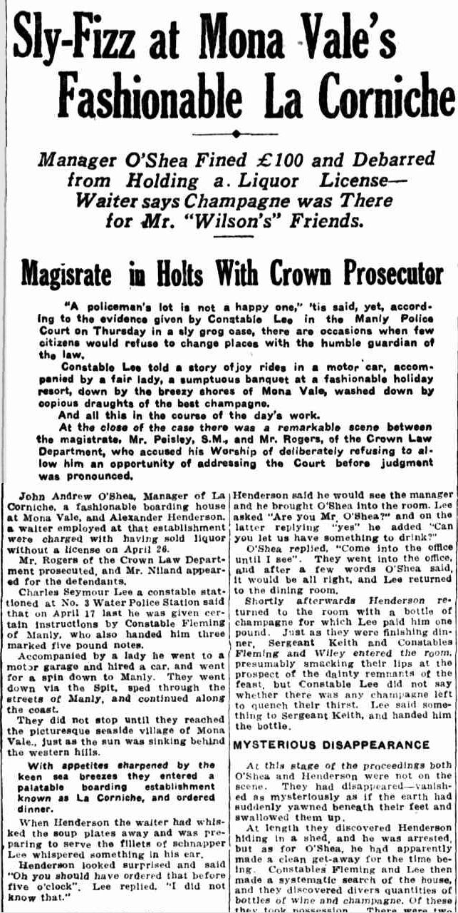 BIG FIRE AT MONA VALE, THIRTY BOARDERS ESCAPE IN NIGHT- ATTIRE. - .DAMAGE ESTIMATED. AT £30,000. SYDNEY, Monday A disastrous conflagration, the resulting damage of which is estimated at £30,000, early this morning destroyed Brock's Mansions at Mona Vale, 20 miles from Sydney, and 14 miles from Manly. The premises were conducted as an extensive boarding house by Madame Reineud, who shortly before the 1am woke out of her sleep to find the place on fire- She-aroused her boarders, some 30 in number, all of whom were compelled to fly from their rooms in their night attire, having no time to take either their clothes or jewellery with them. The boarders were barely out of the place when the building was a roaring mass of flames. One of the boarders motored to Manly, but the fire brigade refused to proceed to Mona Vale, as there was no reticulation service and as it was not in the brigade's district. The fire burnt itself out, leaving nothing but a mass of ruins. The fire is supposed to have been caused by the burning butt of a cigar having been carelessly thrown on the dining-room carpet.