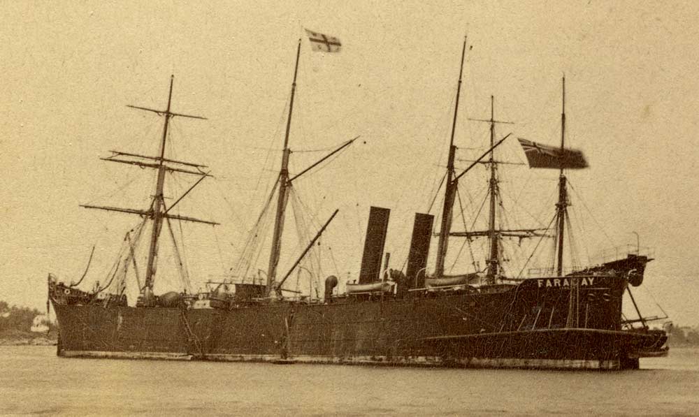 Oval black and white photograph of the landing of the New Zealand to Sydney telegraph cable at La Perouse in 1876. Photographer unknown. It shows a line of men on the beach, hauling the cable in. A paddle steamer and the two cable laying sailing ships EDINBURGH and HIBERNIA are lying offshore. On the reverse is handwritten "Landing of Sy NZ Cable/ La Perouse Waka/ 1876/ Edinburgh- Hibernia". Also present are blue coloured pencil annotations. The word "waka" written on the back was the call sign used by the Cable Bay station in New Zealand. Courtesy of the Australian National Maritime Museum. Also in State Library of NSW online photographic collection.