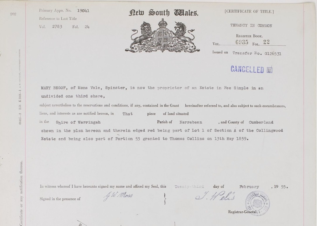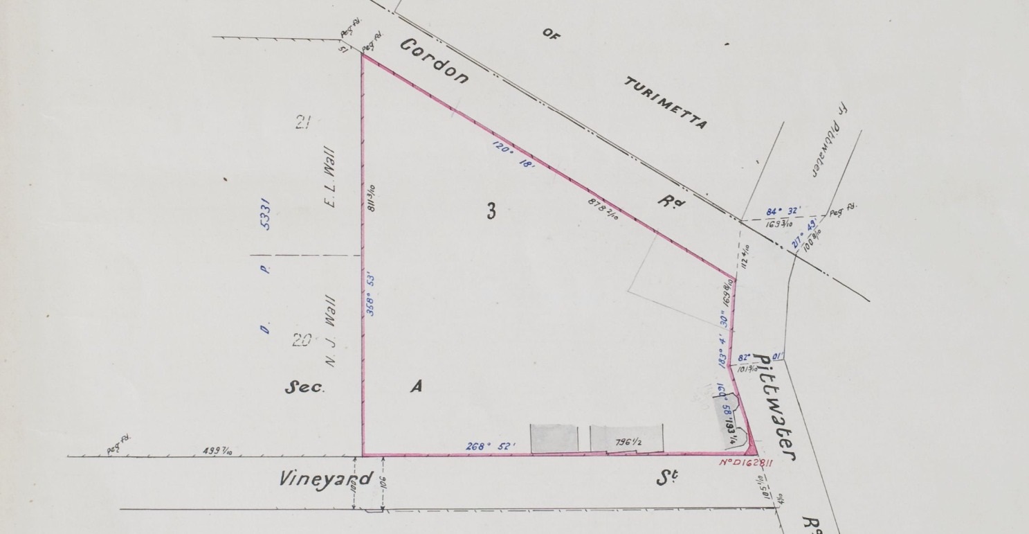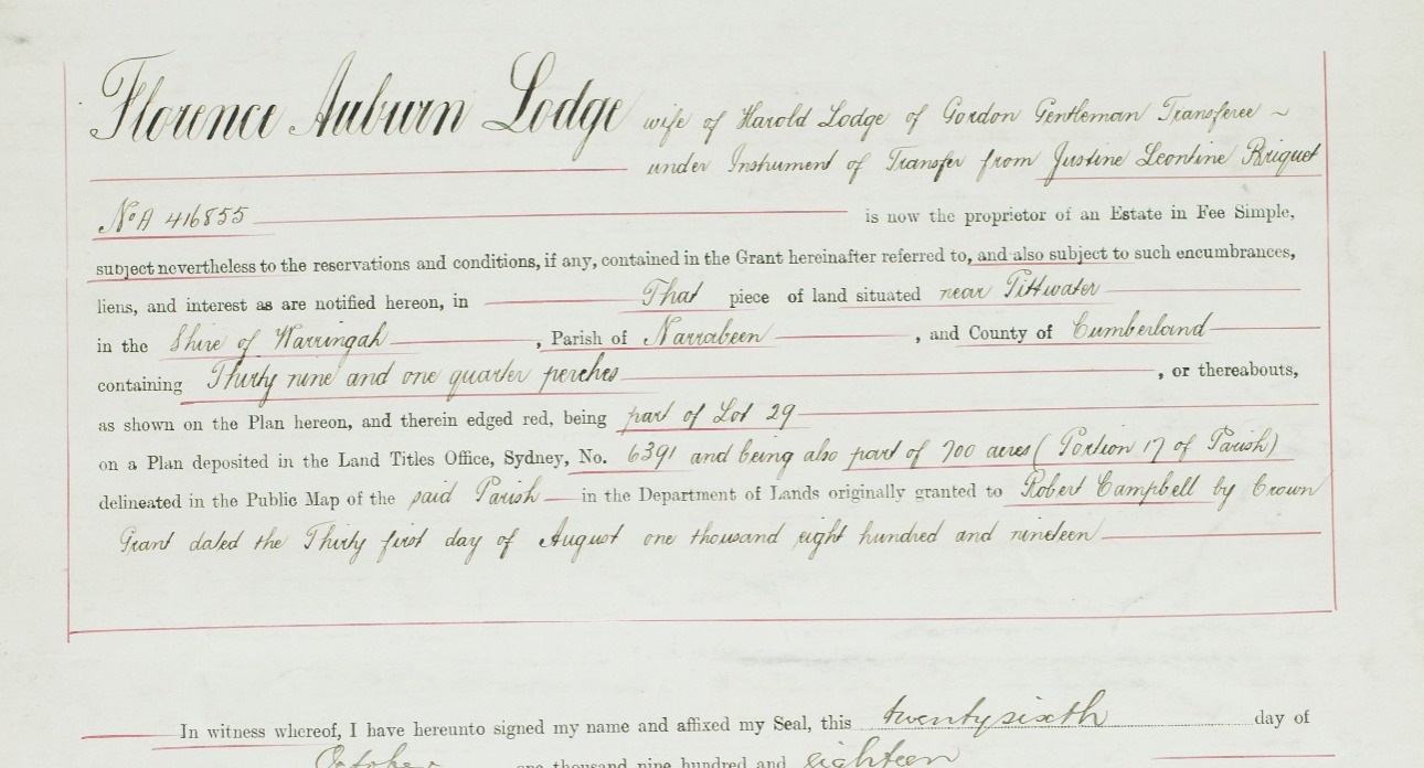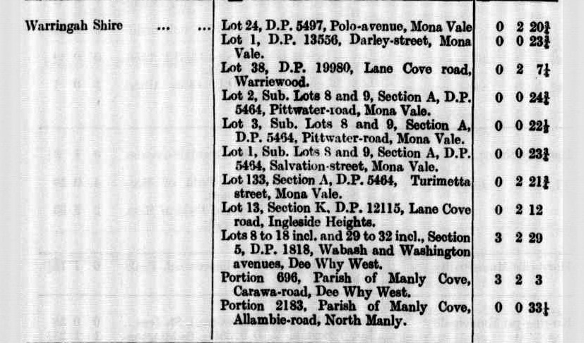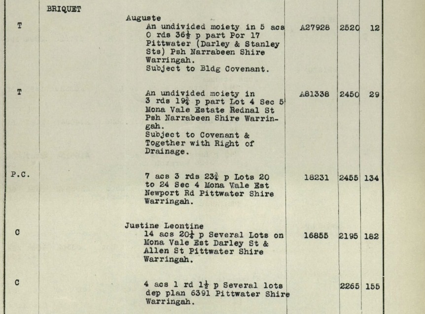 No. 19,041. APPLICANT:— Justine Leontine Briquet, Mona Vale. LAND: — County Cumberland, parish Narrabeen, shire Warringah, 6a. 27p. and 21 p., on Pittwater-road, — part lot 1, section A, Collingwood Estate, and part 115n. 2r, (portion 53, parish),granted to Thomas Collins; adjoining properties of Salvation Army, Cau and Schwartzcopf, and Crown Land. Advertising (1917, March 10). The Sun (Sydney, NSW : 1910 - 1954), p. 8. Retrieved from http://nla.gov.au/nla.news-article221960721