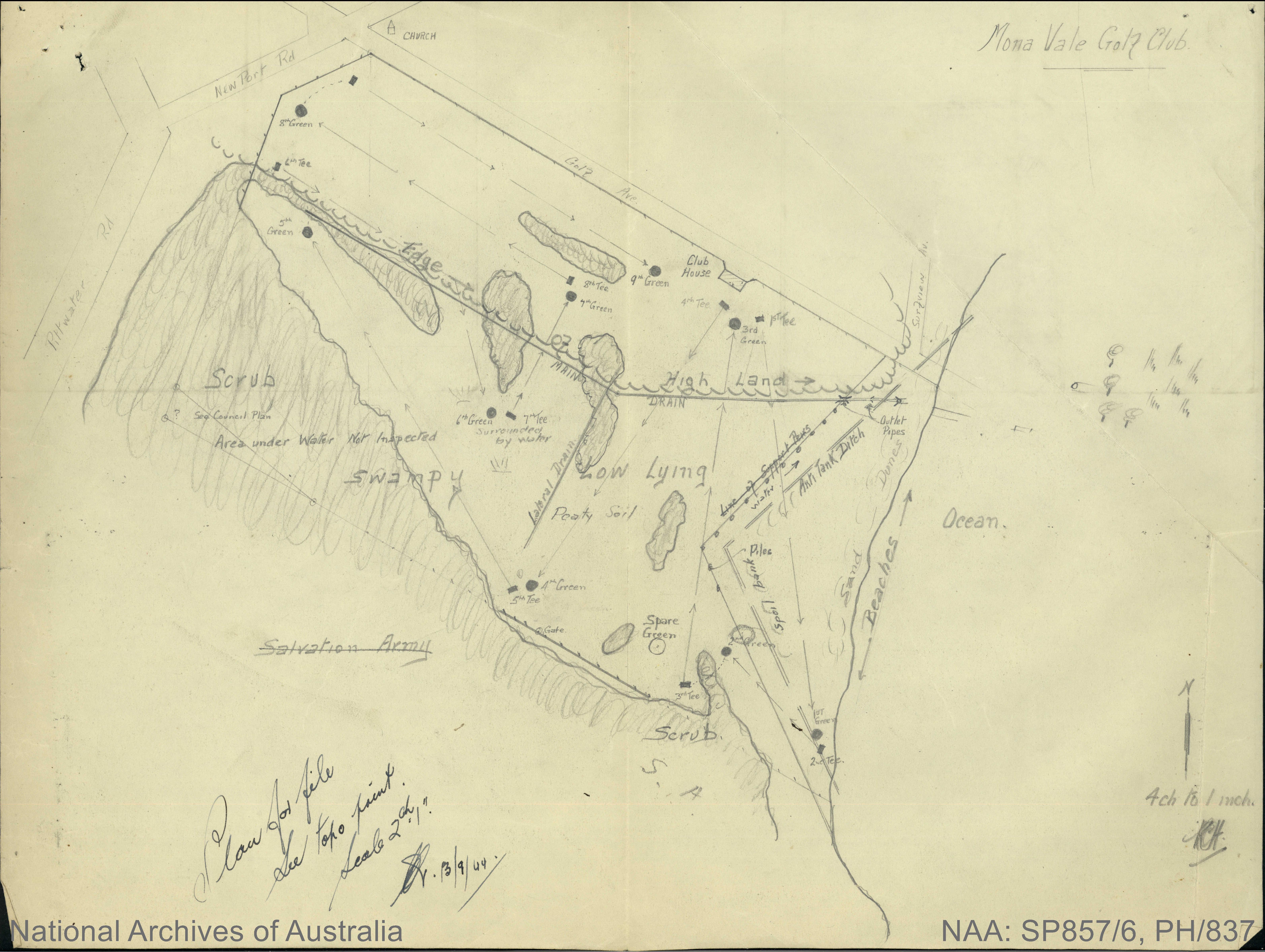 MVGC Rehabilitation by Army map dated 28th of August 1944, courtesy National Archives of Australia - this shows the areas that were then underwater or swampy and the areas that were scrub, along with where the tank trap had been built alongside the beach