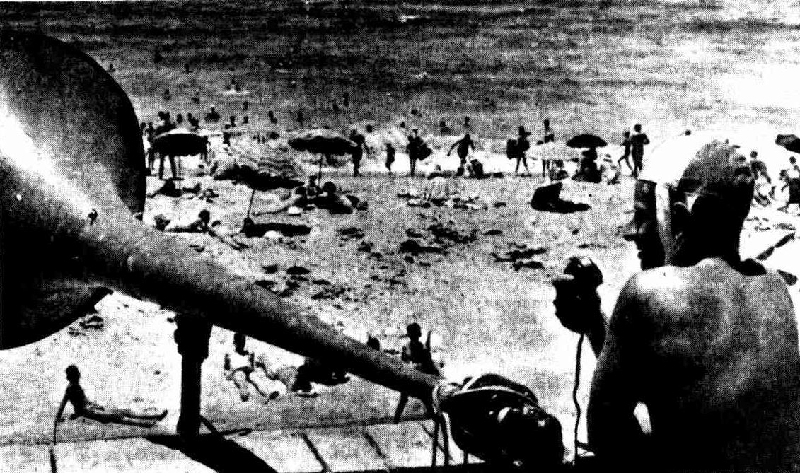 Collaroy lifesavers on and off duty yesterday. (Above) John Allan uses the public address system on the look-out over the club's new, partly builtclubhouse to warn swimmers to surf only inside the safety flags. ONE LIFESAVER WARNS SURFERS; SECOND SPORTS SEA-SHELL HAT (1954, November 29). The Sydney Morning Herald (NSW : 1842 - 1954), p. 1. Retrieved from http://nla.gov.au/nla.news-article18454764