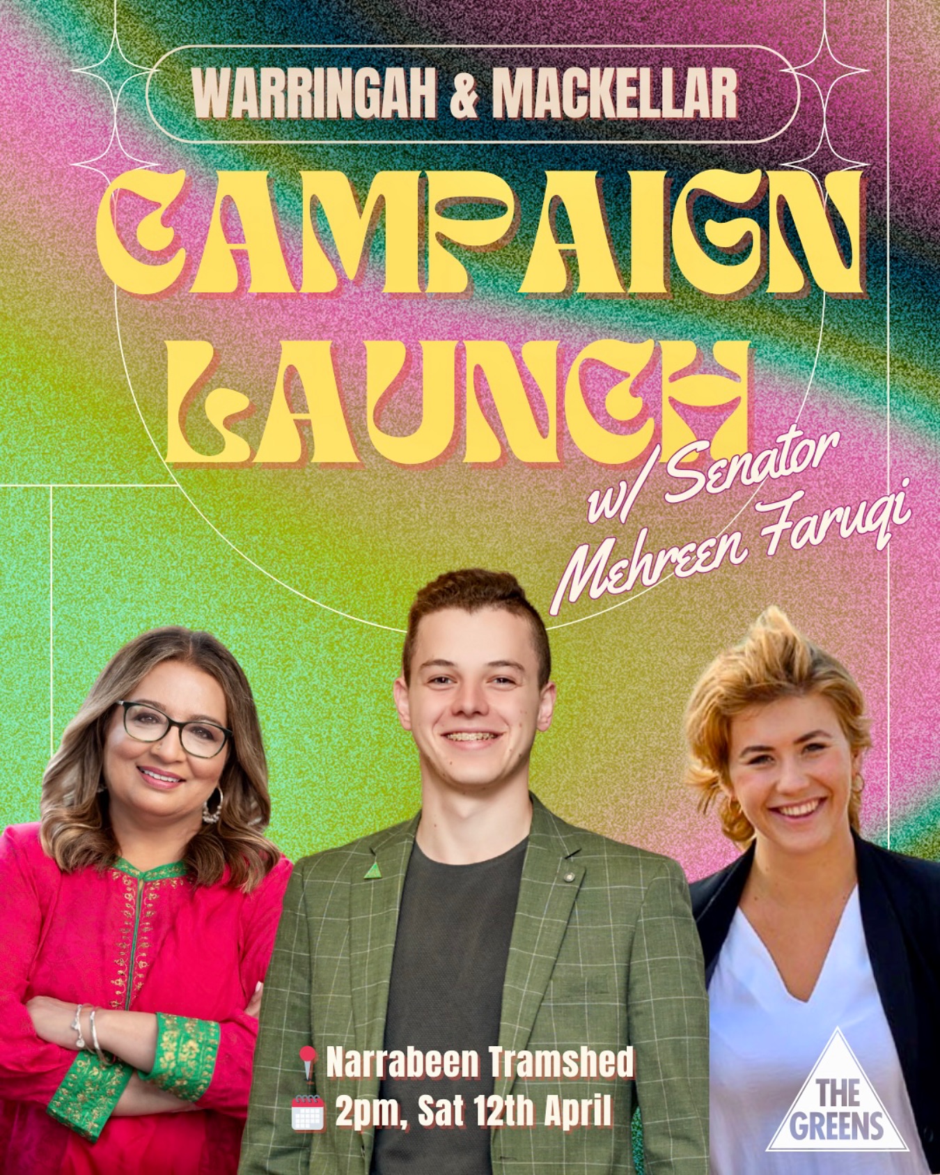 The Greens candidates for Warringah and Mackellar and Senator Faruqi will be hosting a Northern Beaches campaign launch on 12 April at 2PM at Narrabeen Tramshed.