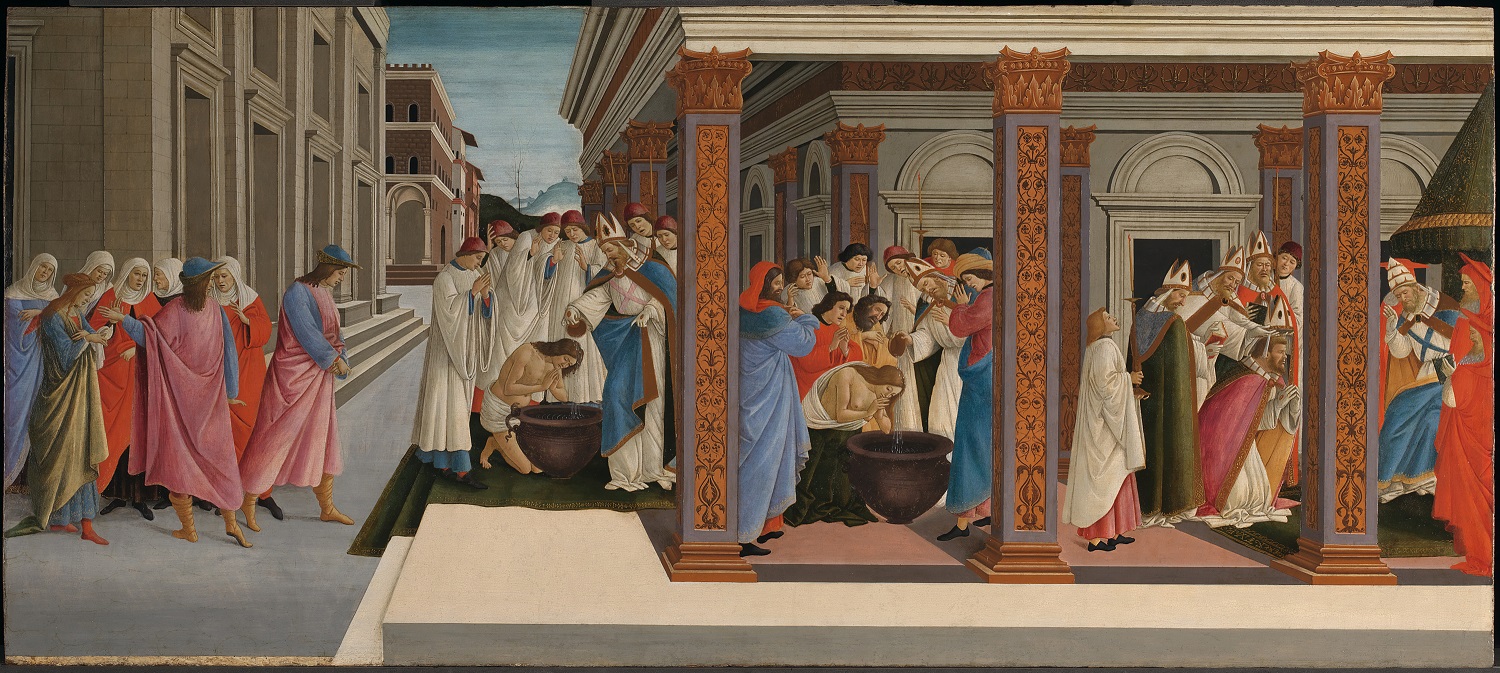 Botticelli has painted young men in white robes as witnesses to many of these episodes; they may represent members of the religious youth group dedicated to the saint, the Compagnia della Purificazione e di San Zanobi (‘The company of the Purification and of Saint Zenobius’). It is possible that Botticelli painted these panels for their rooms.