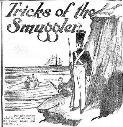 Tricks of the Smuggler By . . E. S. Sorenson. SMUGGLING was a more or less active waterside industry even before the roaring days of the goldfields, which attracted hordes of Chinese to the country. Pittwater seems to have been the first port for the illegal traffic. A custom house stood at Barrenjoey, where the officer in charge had many a brush with the smugglers. At last the official rigged up a dummy soldier to scare them oft". The figure was made of wood, dressed in white trousers, scarlet coat, and tall tin helmet stir mounted with a plume. With a sword in hand and scabbard at his side, Dummy was stationed in front of a cave near the present lighthouse, and for a time his presence caused the smugglers to sheer oft". Then one wily mariner, after a long scrutiny, noticed that the sentinel never moved, even to scratch himself. So he sailed in, and the ruse was exposed. But the figure remained for years afterwards, till white ants ate his legs away and he collapsed. Tricks of the Smuggler. (1936, May 29). The Land (Sydney, NSW : 1911 - 1954), p. 14. Retrieved from http://nla.gov.au/nla.news-article104230976