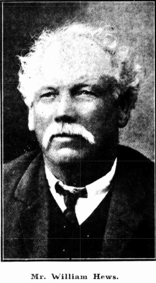 William Hews was born at Brighton, on May 1.3, 1844. With his parents he landed in Sydney in December, 1852, and started to work as a lad of 0 for the Hon. George Lord at his tweed factory at Botany. He had charge of a machine called "a devil," which was used for (easing the wool. Mr. Hews' parents left the city, and went on the land, but had a bitter experience. Soon after settling down a flood came and washed everything away, leaving the settlers penniless. Returning to the city, and while engaged in building the line between Parramatta and Liverpool (in the employ of his father) he had the misfortune to cut off his big toe.