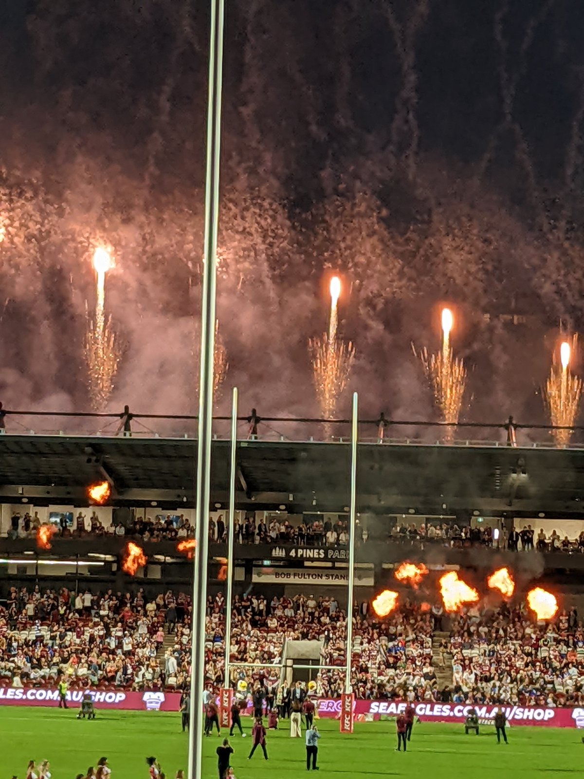 A fantastic pyro display lit up the Bob Fulton Stand following the ribbon cutting which was attended by the Hon. Stuart Ayres, MP Minister for Tourism and Sport, Jason Falinski MP (Federal Member for Mackellar), Sea Eagles Chairman Scott Penn, and the Fulton Family led by Bob’s wife Anne and children Scott, Brett and Kristie.