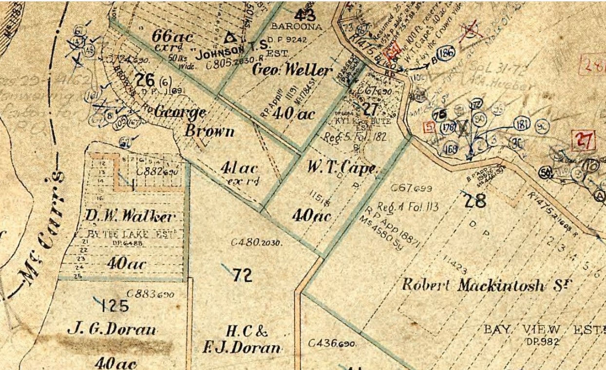 George Brown was granted 41 acres on McCarrs creek with the Certificate of Title registered on 14th of November 1879 and on what is the current site of Browns Bay.