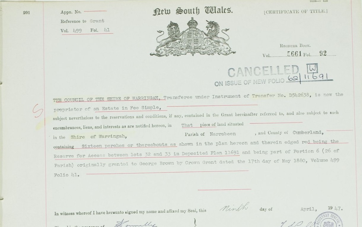 In conformity with the provisions of the Act of Council, William V , No 11, section 21, George Brown being the owner of portion No 6, parish of Narrabeen, applied to the Chairman of the Quarter Sessions for an accommodation road from his land to run through land supposed to be the property of trustees of the Wesleyan Church, Dr Tibbetts and Alfred McIntosh being part of Olivers grant, portion 7, until it should meet the road from Manly, at the public wharf Church Point, Pittwater, such being the nearest highway. Evidence was given by the applicant that he had no thoroughfare nor right of away to get to a highway from his land as described consisting of 41 acres, and the accommodation road he now applied for was the best available, considering all the interests. No objection was raised to the road being made and the application was granted by His Honor. QUARTER SESSIONS. (1897, November 19). The Sydney Morning Herald (NSW : 1842 - 1954), p. 3. Retrieved from http://nla.gov.au/nla.news-article14100043