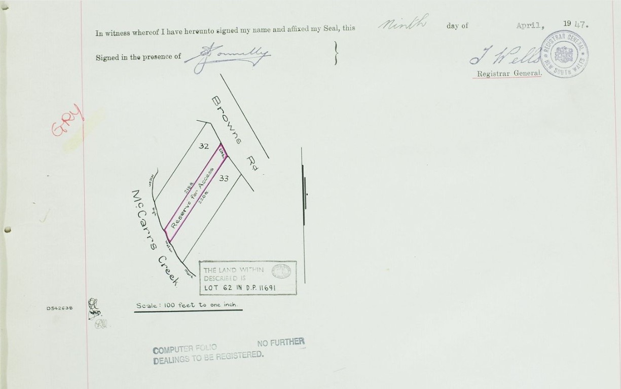 All that piece or parcel of land situate in the Shire of Warringah, parish of Broken Bay and county of Cumberland, containing an area of 40 acres and having a frontage to McCarr's Creek, being portion 2 of parish, being the whole of the land comprised in Crown Grant Vol. 835, folio 235,— said to be in the possession of the estate of the late William Scott Fell, and shown on plan with the Department of Local Government, Sydney. (922). LOCAL GOVERNMENT ACT, 1919 (1959, July 10). Government Gazette of the State of New South Wales (Sydney, NSW : 1901 - 2001), p. 2079. Retrieved from http://nla.gov.au/nla.news-article219940470