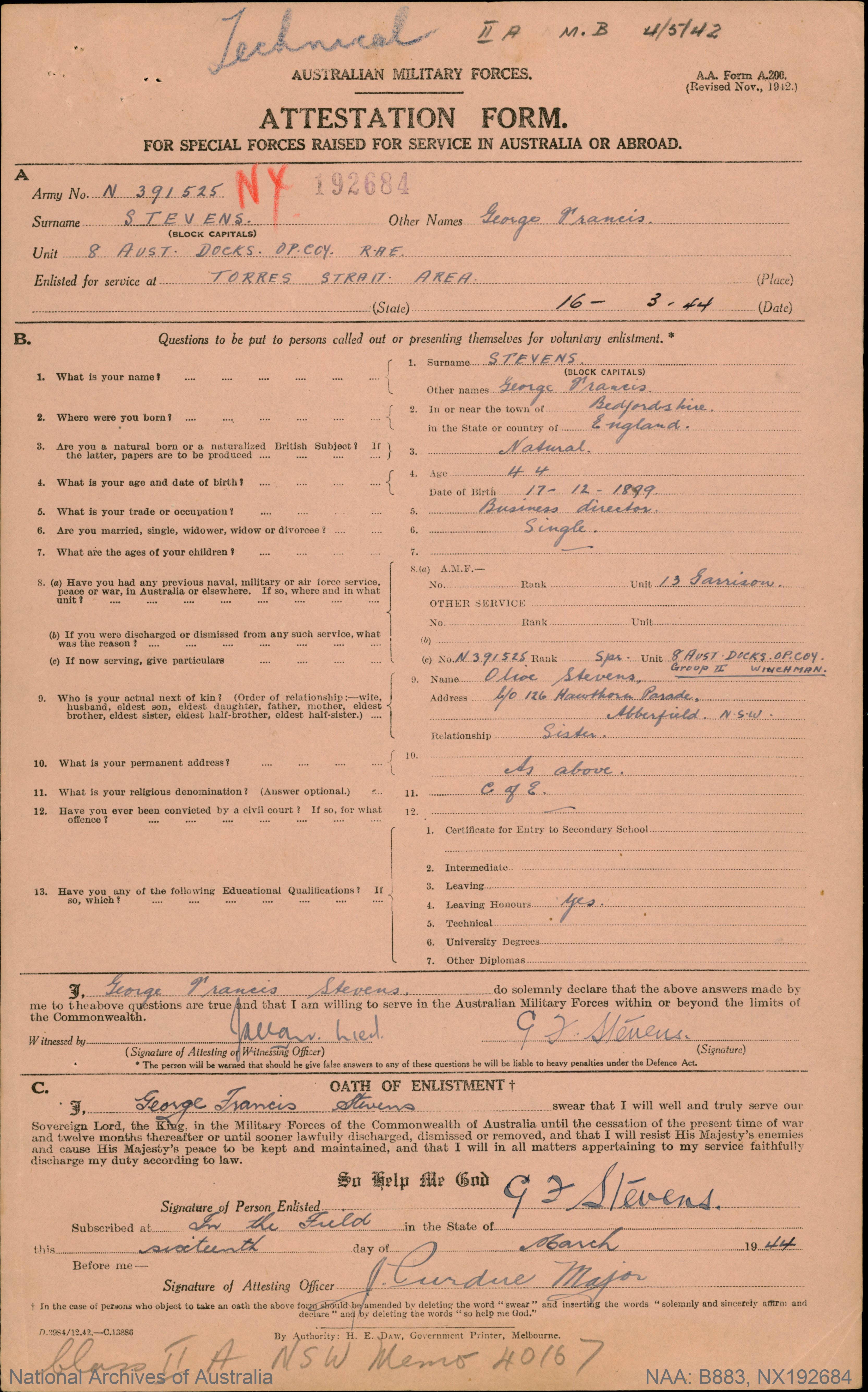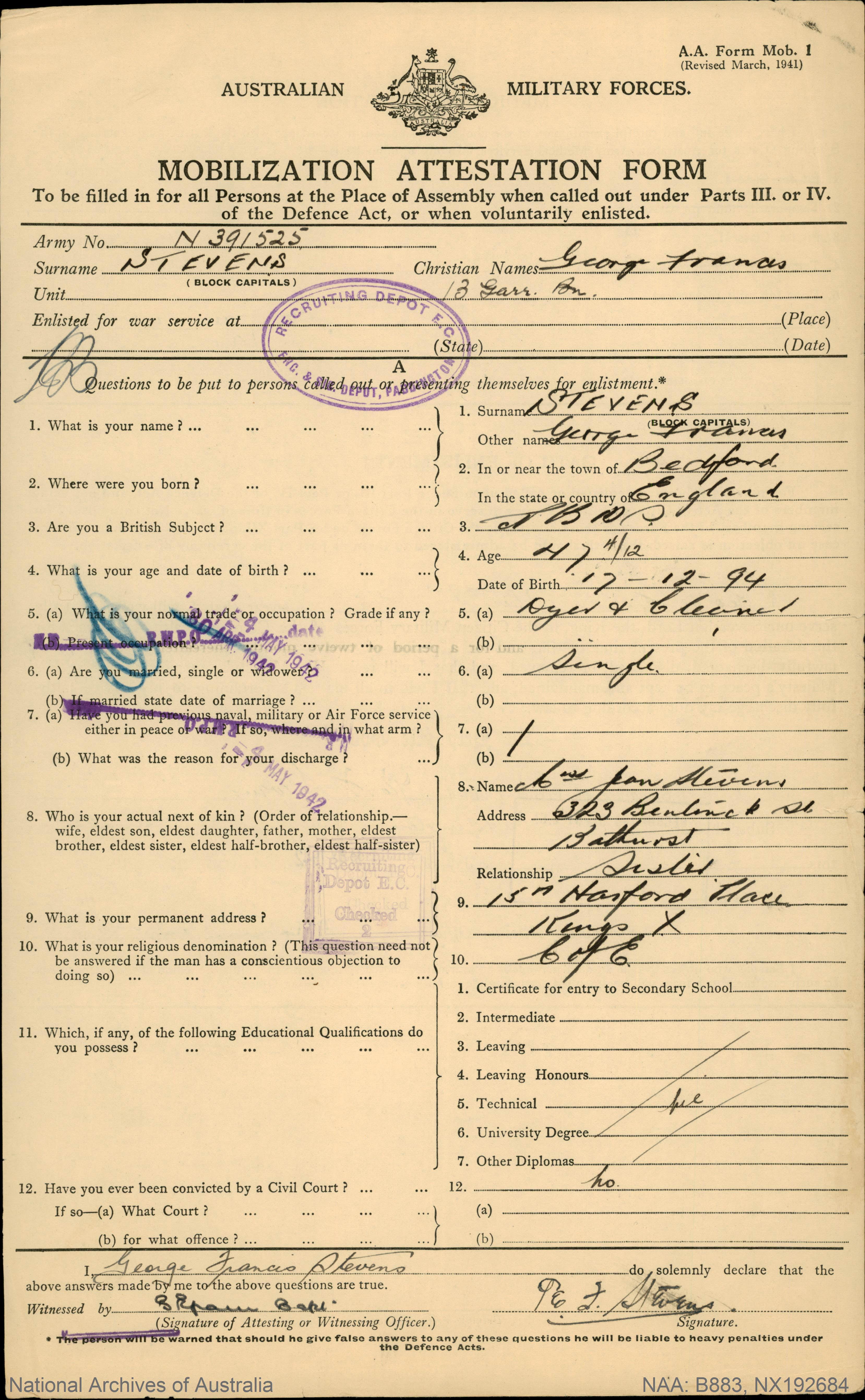 George's father's occupation is listed as 'Blacksmith' although by the time they moved to Launceston he worked as a postage messenger. They moved to Sydney in 1847 and lived in Walker street, Redfern.