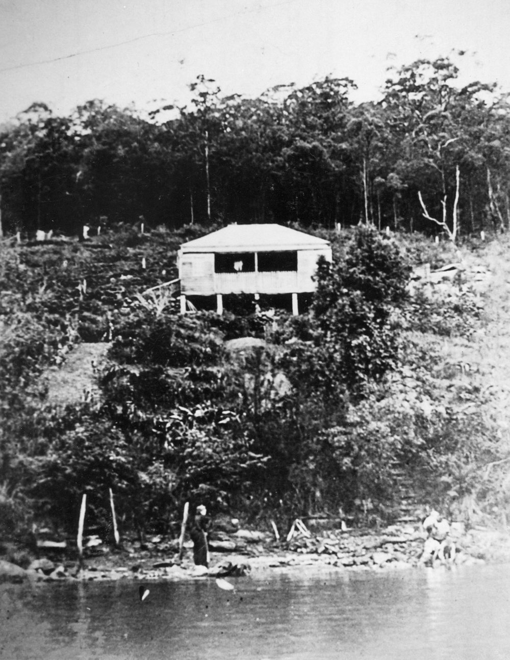 The estate extended right to the head of the bay, where there is a gully, clad in various kinds of flora interesting to the botanist. Two old peach trees grew in front of the verandah, which was supported on pillars and at the head of the bay, passion-fruit vines grew over the rocks and trees.
