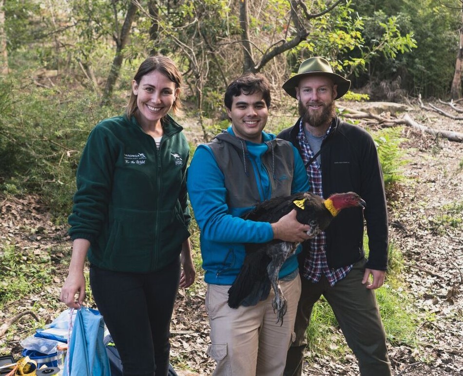 The brush turkey research team, led by Sydney doctoral candidate Matthew Hall (centre) with Taronga's Dr Alicia Burns and Dr John Martin from the Royal Botanic Garden.