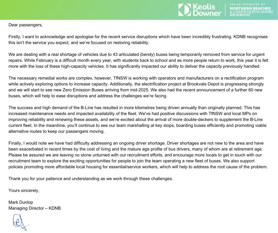 Keolis Downer northern beaches has also issued a statement this week, posting on social media on Thursday March 13 the following:
