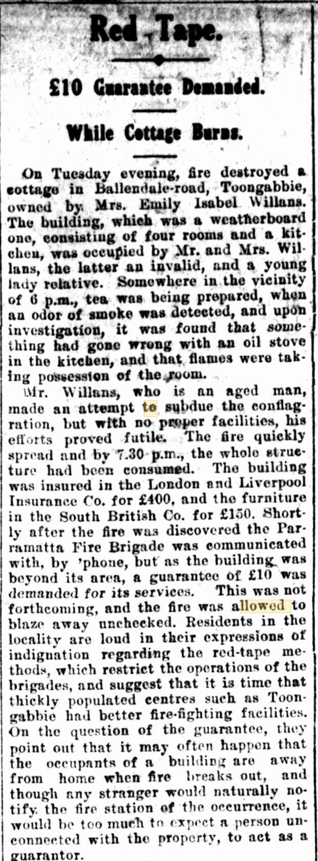 A seven-roomed cottage, owned and occupied by Mr George Brown, of McCarr's Creek. Pittwater, was destroyed by fire on Sunday evening. Rats gnawing at wax matches is the supposed cause of the fire. GLEANINGS. (1912, March 7). Singleton Argus (NSW : 1880 - 1954) , p. 1. Retrieved from http://nla.gov.au/nla.news-article80059234