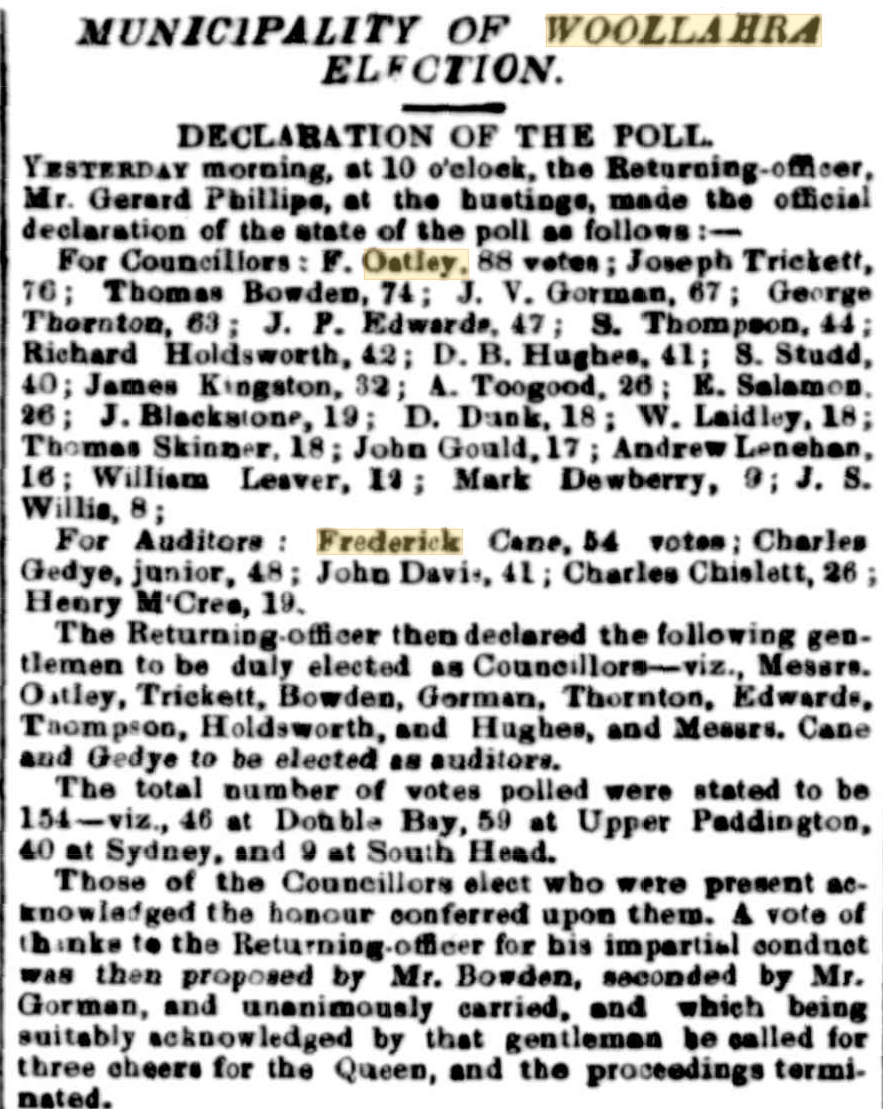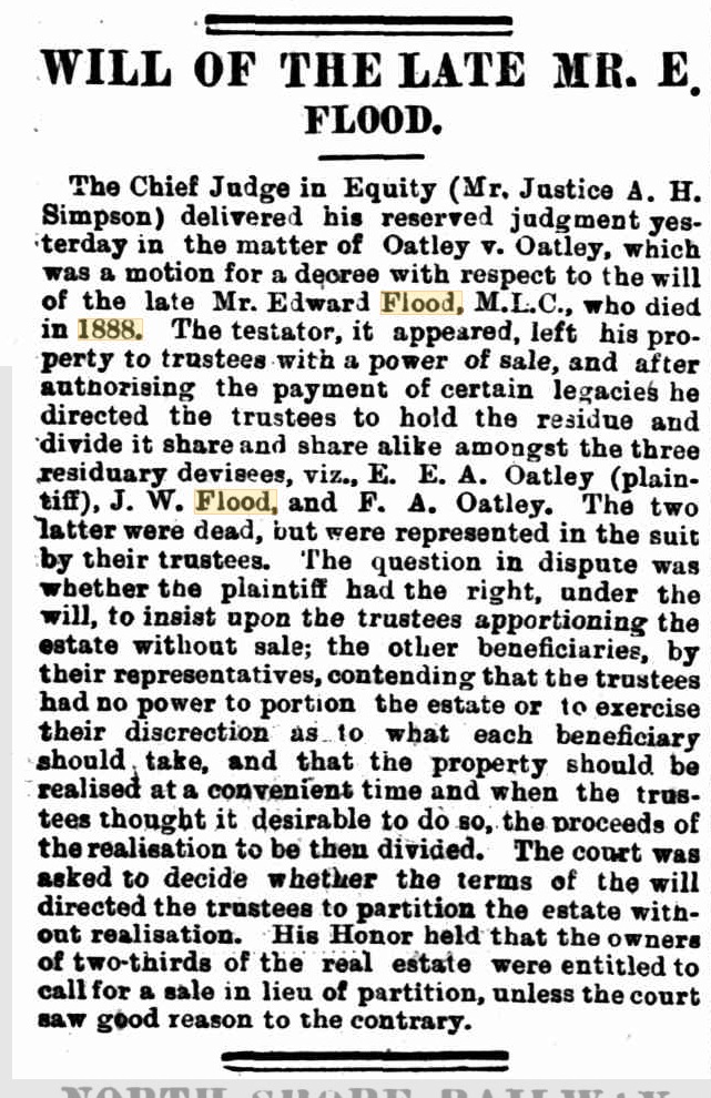 A slice of even older Sydney is shown in that the grandfather of two of the 1890's developers, E.E. A and F. A Oatley, is James Oatley, the gentleman who was paid £75 to provide the 'town clock' for the Hyde Park Barracks, while Joseph Washington Flood the other landholder, had a mother, Charlotte (nee Hannam), wife of Edward Flood MLC, who first met Mary, the mother of James' sons Frederick and James Jnr. when a child aboard the Northampton that arrived in Sydney Town on June 18th, 1815.
