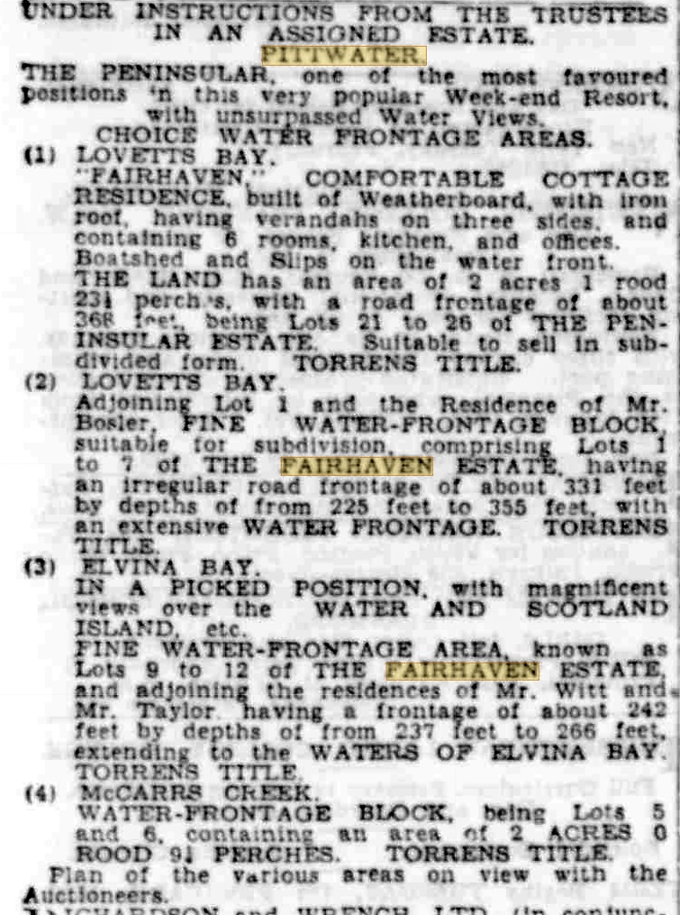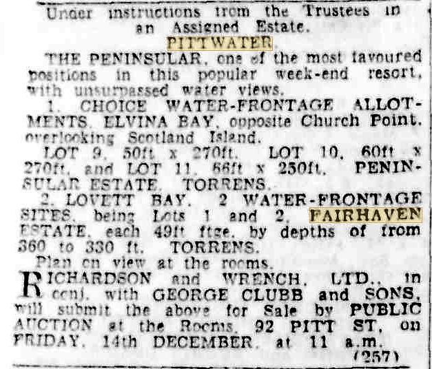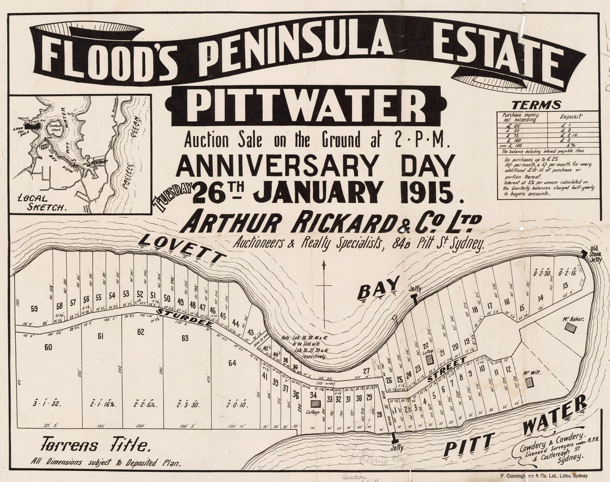 RICHARDSON and WRENCH have received instructions to sell by public auction at the Rooms, Pitt-street,' on FRIDAY, 19th MAY, at 11 o'clock, The ABOVE-DESCRIBED 30-ACRE FARM at Pittwater, within easy distance- 1 ½ mile -of the Newport STEAMERS' WHARF. Terms at sale. Advertising (1882, May 17). The Sydney Morning Herald (NSW : 1842 - 1954), p. 11. Retrieved from http://nla.gov.au/nla.news-article13511387