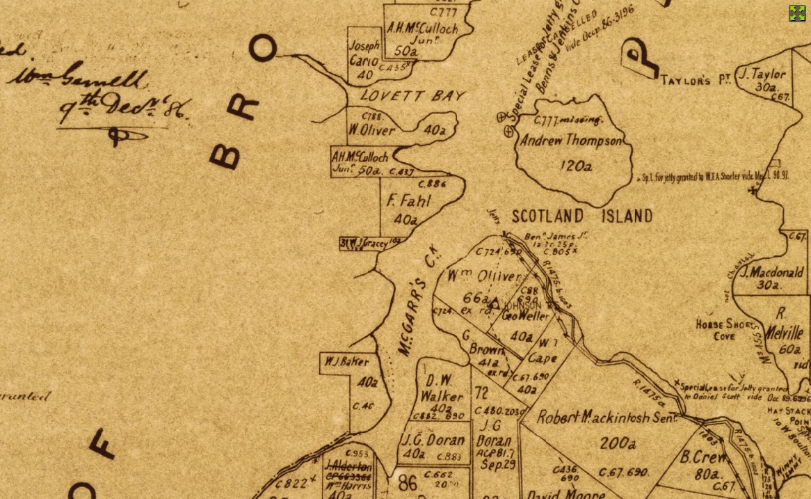 William Oliver’s second land grant was 40 acres at Lovett Bay, adjacent to his Elvina Bay land. He became the purchaser by Conditional Sale for £40 on 4 March 1862, and it was formally granted to him on 27 September 1866. [LTO Vol.34 Fol.84]