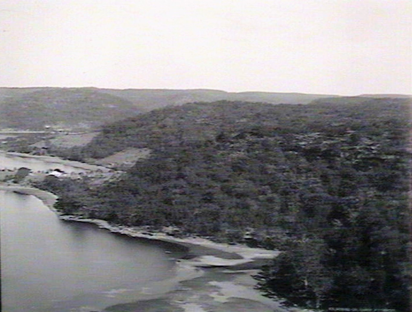 'Scotland Island, Newport, Pittwater, N.S.W.', photo by Henry King, Sydney, Australia, c. 1880-1886. and section from to show cottage on neck of peninsula at western end with no chimneys through roof. From Tyrell Collection, courtesy Powerhouse Museum