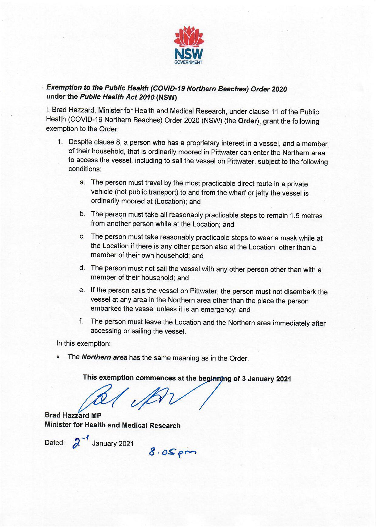 The restrictions currently in place for the northern zone of the Northern Beaches (Pittwater) remain in place until 12.01am on Sunday 10 January. NSW Health is closely monitoring the situation and thanks the community for their ongoing cooperation. After that Pittwater residents are subject to the same restrictions as that currently in place for Greater Sydney:
