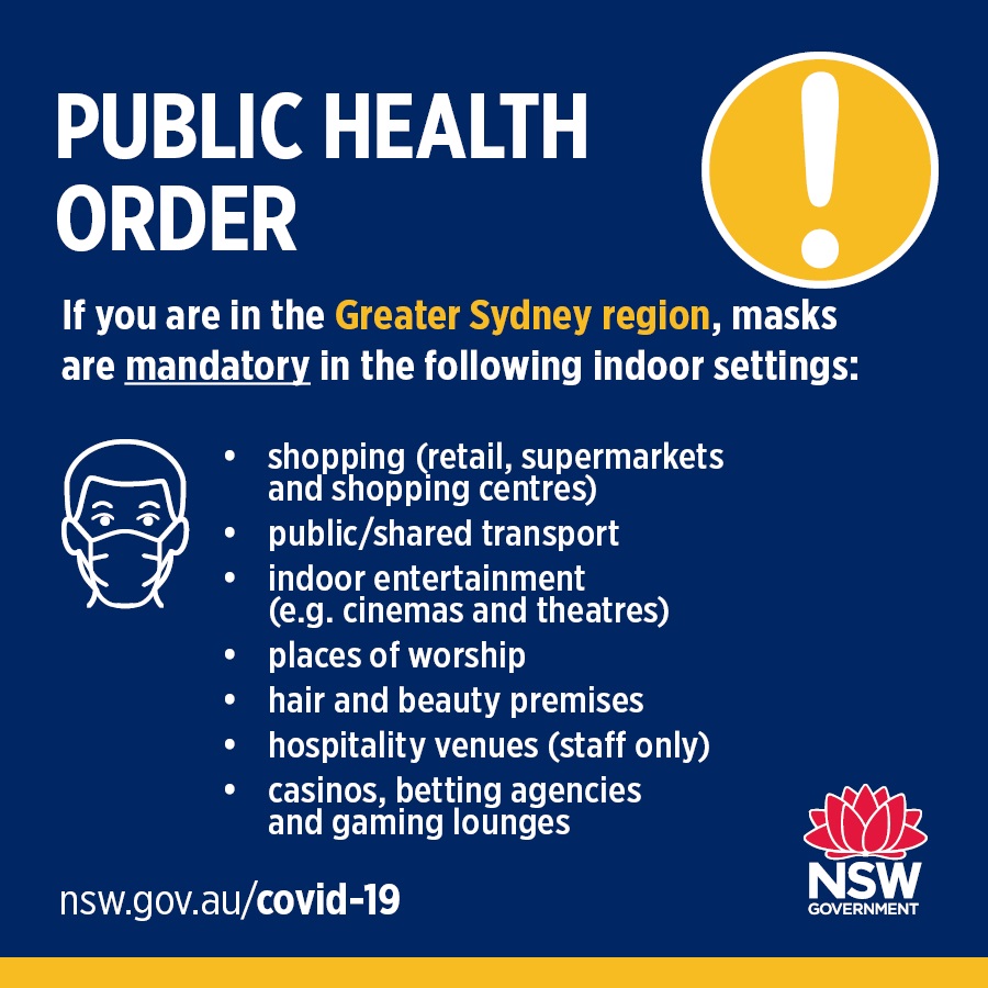 In Greater Sydney, Central Coast and Wollongong areas, it is mandatory to wear a face mask indoors.
