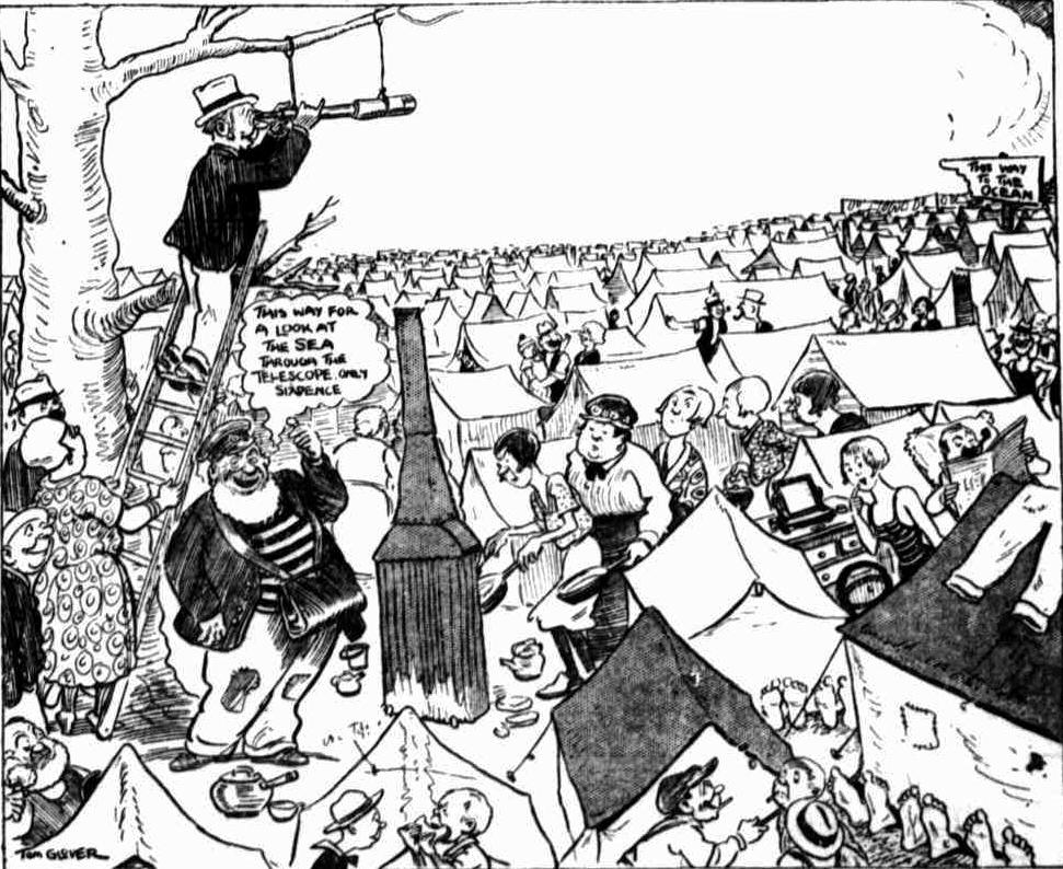 The Warringah Shire Council has received complaints about the crowded condition of the camping areas at Palm Beach. On some blocks more than 60 persons are living. Over 20,000 persons visit the beach on fine Sundays. What will it be like in five years' time? VISUALISING THE CAMPERS' PARADISE (1930, January 15). The Sun (Sydney, NSW : 1910 - 1954), p. 13 (LAST RACE EDITION). Retrieved fromhttp://nla.gov.au/nla.news-article226022076