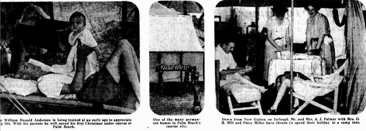 But there are three Palm Beaches: south Palm Beach of the columnists' darlings; north Palm Beach of the campers on the peninsula, whose tents line the little golf course; and the Palm Beach of the day tourists, who romp everywhere during the week-end. Rubbing: along fairly well together, they rub a lot of Palm Beach glamor off in the process. Palm Beach aristocracy huddle quite definitely into groups at the week-end among the surrounding trippers. To smile for a photographer is one thing: but to smile at a tripper. . . .! And with the cads are In bathing suits, it's so hard to tell the difference.