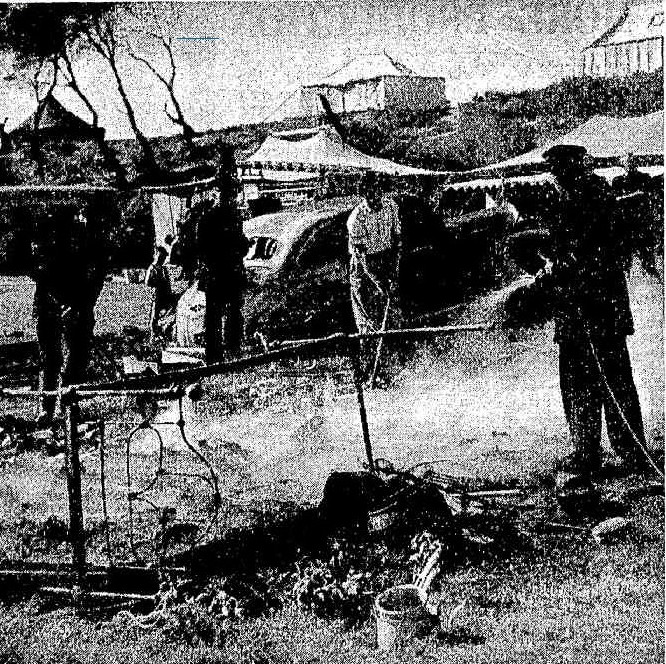 The fire broke out when a spirit stove exploded in Mrs. E. Crew's camp. A breeze swept the flames to other camps within minutes. Firemen, police and volunteers pulled down two camps and used them as fire breaks.