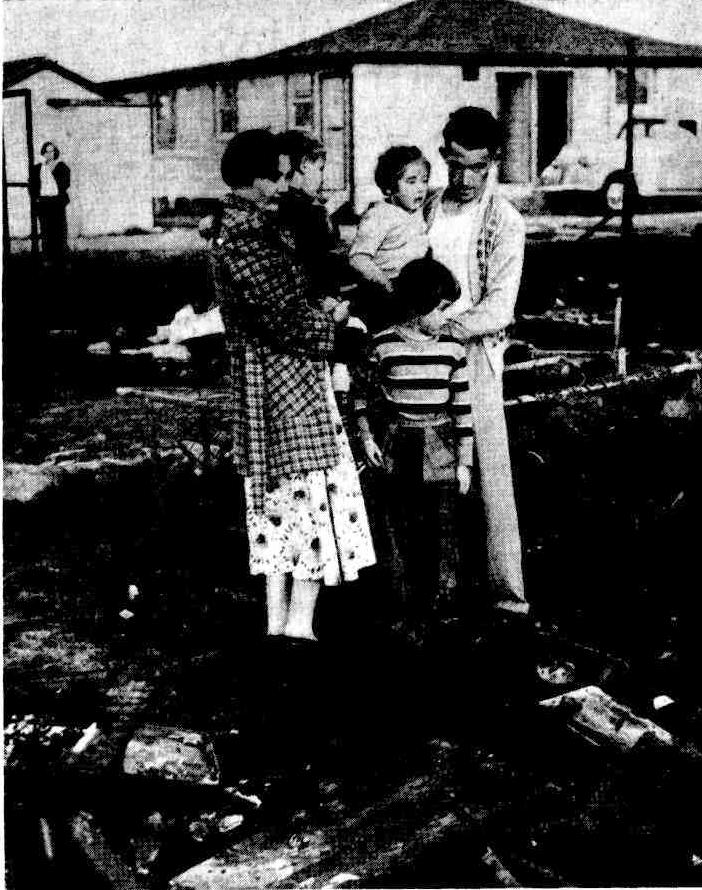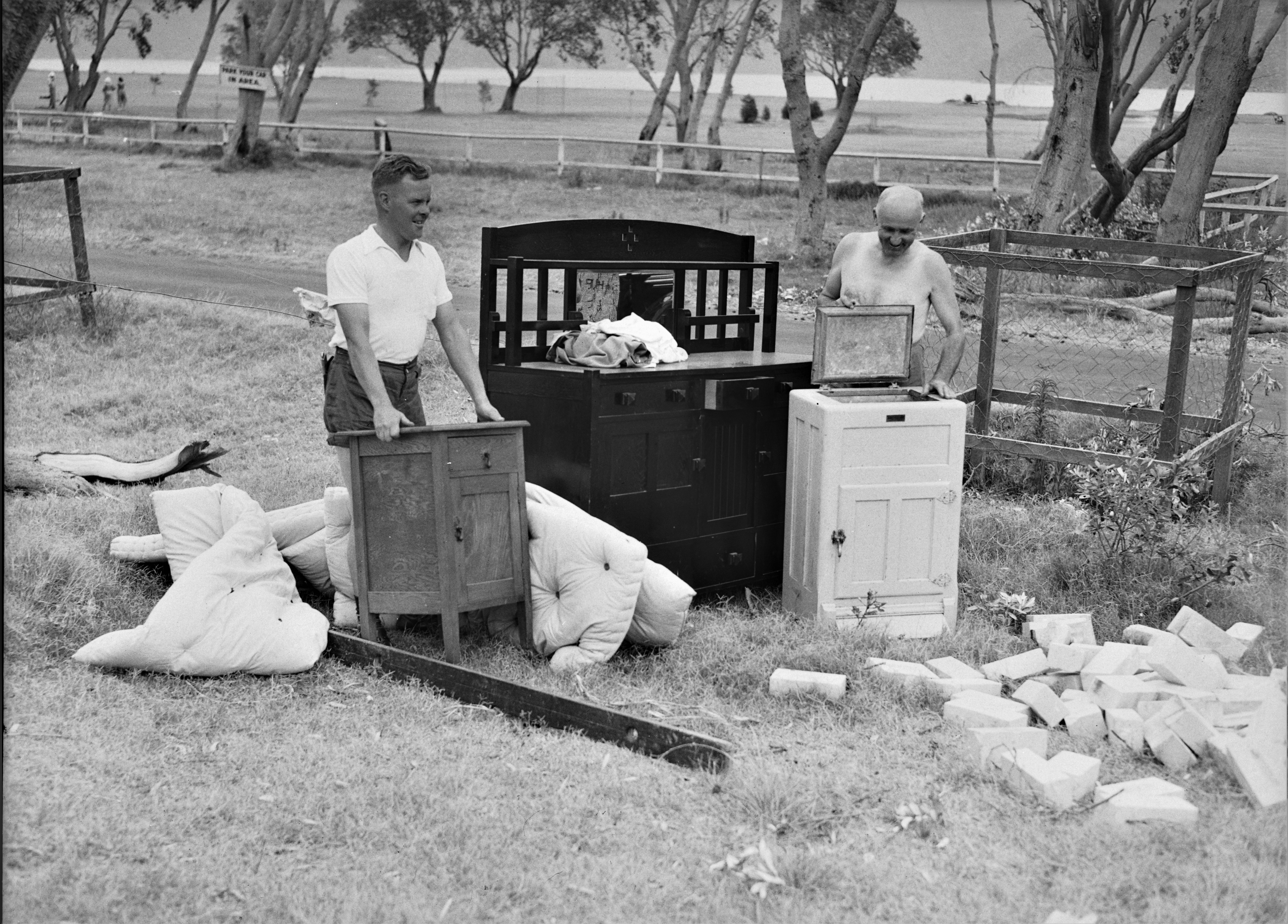 Mr. and Mrs. Donald Maloney and their children looking at the remains of their Palm Beach camp home which was destroyed by fire yesterday afternoon. They lost all their possessions in the fire. Fire Destroys 11 Camps At Beach (1954, June 21). The Sydney Morning Herald (NSW : 1842 - 1954), p. 1. Retrieved from http://nla.gov.au/nla.news-article18437565