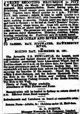POPULAR EXCURSIONS TO THE HAWKESBURY RIVER, PITTWATER, AND PORT HACKING(Weather Permitting), from Wharf, foot of Market street, at 10 a.m. BOXING DAY, WEDNESDAY, DEC. 26, S.S. NAMOI 1414 tons, to COWAN BAY, HAWKESBURY RIVER. S.S. SYDNEY, 534 tons, to CAREEL BAY, PITTWATER. PUBLIC HOLIDAY, WEDNESDAY, JANUARY 2,S.S. Newcastle, 1251 tons, to Cowan Bay(Hawkesbury River).S.S. Sydney, 634 tons, to Port Hacking. Excursionists will be landed for about THREE HOURS, arriving in Sydney on return about 6 p.m. Luncheon, 1s 1d, provided by the Company. Refreshments at Moderate Rates. BAND ENGAGED, for each Steamer. -3s. RETURN FARE 3s.CHILDREN, HALF-PRICE.THE NEWCASTLE AND H.R.S.S. CO., LTD.F. J. THOMAS, Manager. Offices: 147 Sussex-street, Sydney. Advertising. (1900, December 22). Evening News (Sydney, NSW : 1869 - 1931), p. 2. Retrieved from http://nla.gov.au/nla.news-article114008745