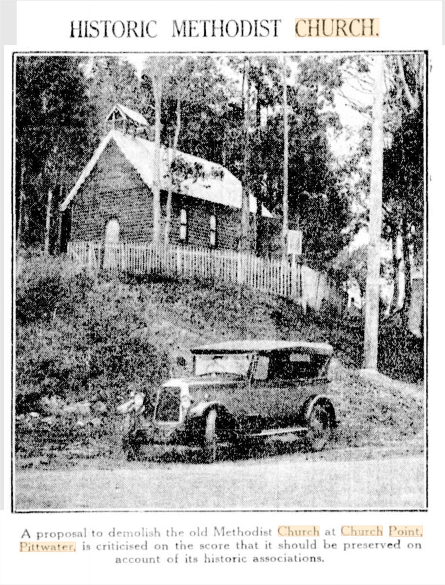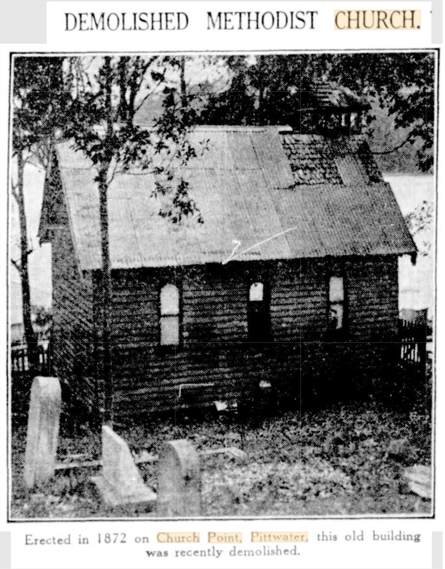 Church Point. The same year, a probationer in his third year, the Rev. Edward J. Rodd was beginning his two years' term at St. Leonard. His circuit extended to Pittwater, and that year the Church Point Church was erected at a cost of £60. The erection of the church was accomplished through the efforts of Messrs. Geo. McIntosh and. Wm, Henry McKeown, who conducted services at Bayview under a tree. Mr. William Oliver gave the site. In many early records it is spoken of as Chapel Point Church. For several years it was used as a public school, and Sir Henry Parkes' signature appears in the old visitor's book. Where is that book now? Diamond Jubilee. (1932, December 17). The Methodist(Sydney, NSW : 1892 - 1954), p. 16. Retrieved from http://nla.gov.au/nla.news-article155292368
