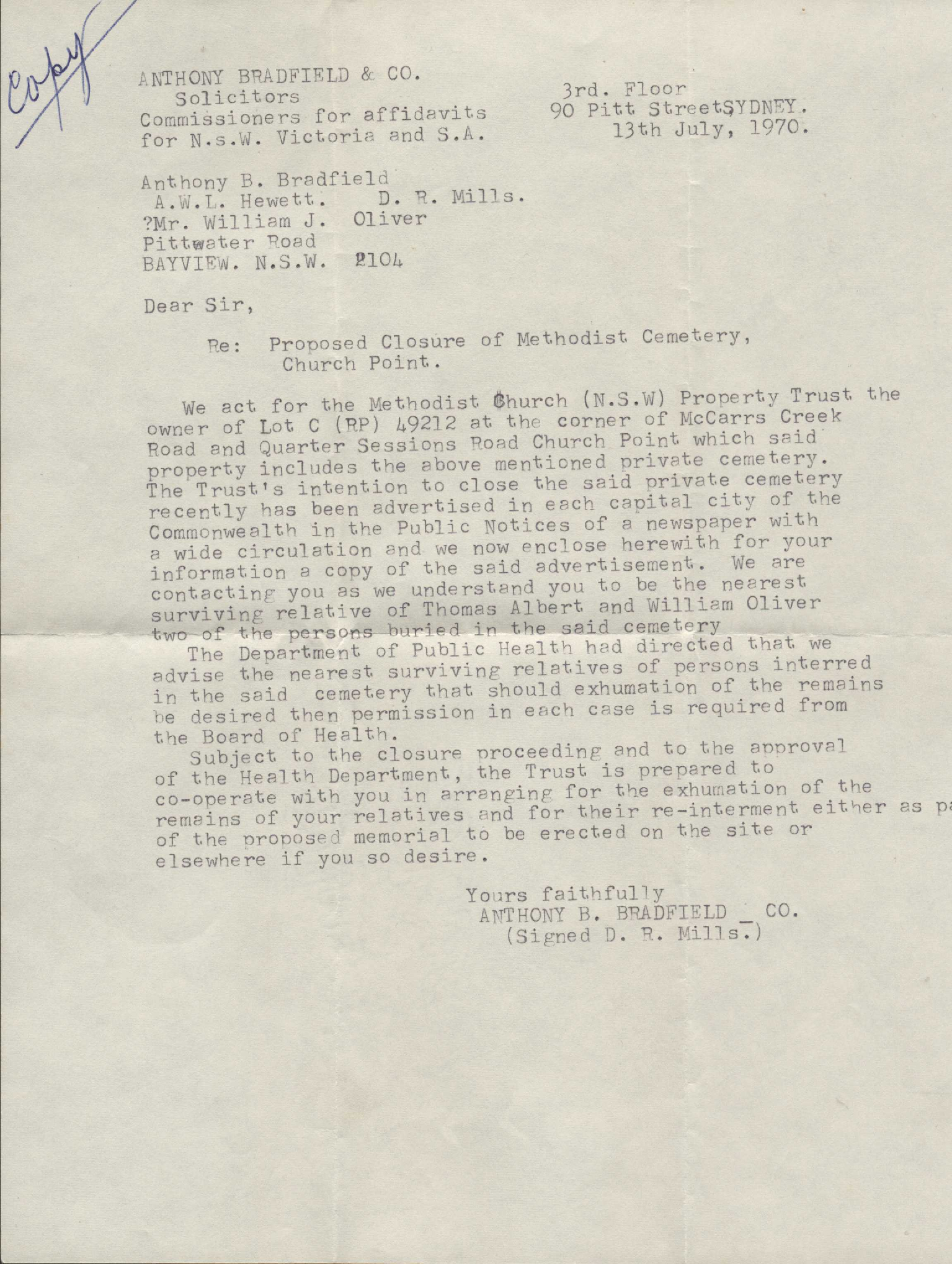 In 1970 the Trustees decided to sell another section of the land and commenced advising descendants as well as the then Warringah Shire Council - the National Archives of Australia documents pertaining to the same read: