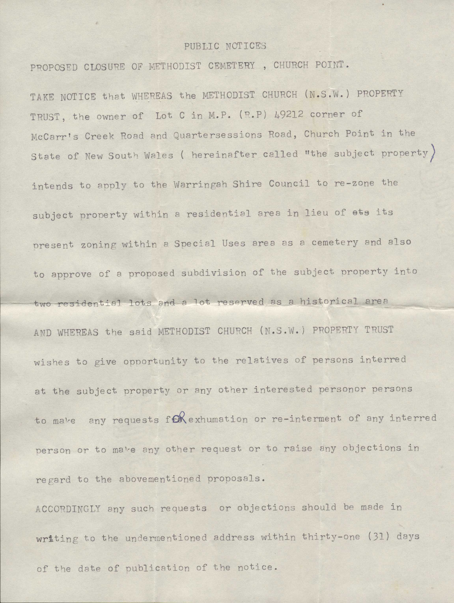 The authorities of the Methodist Church have been asked by the Manly and Warringah Historical Society to protect the little cemetery at Church Point, Pittwater. The cemetery is the burial-place of many of the Pioneers of the district. CHURCH POINT CEMETERY. (1936, April 3). The Sydney Morning Herald (NSW : 1842 - 1954), p. 17. Retrieved from http://nla.gov.au/nla.news-article17327045