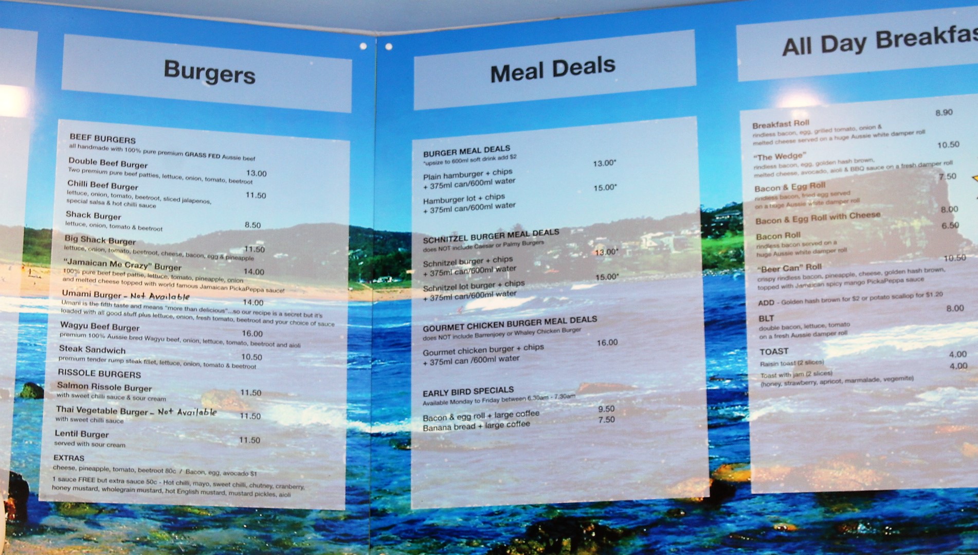 The 'Wedge' is legendary among locals. The Lentil Burger a favourite with vegetarians, the Schnitzels the best you can get while The Lot as a Meal Deal (burger, generous serving of hot chips and a can of drink) will satisfy even the biggest hunger.