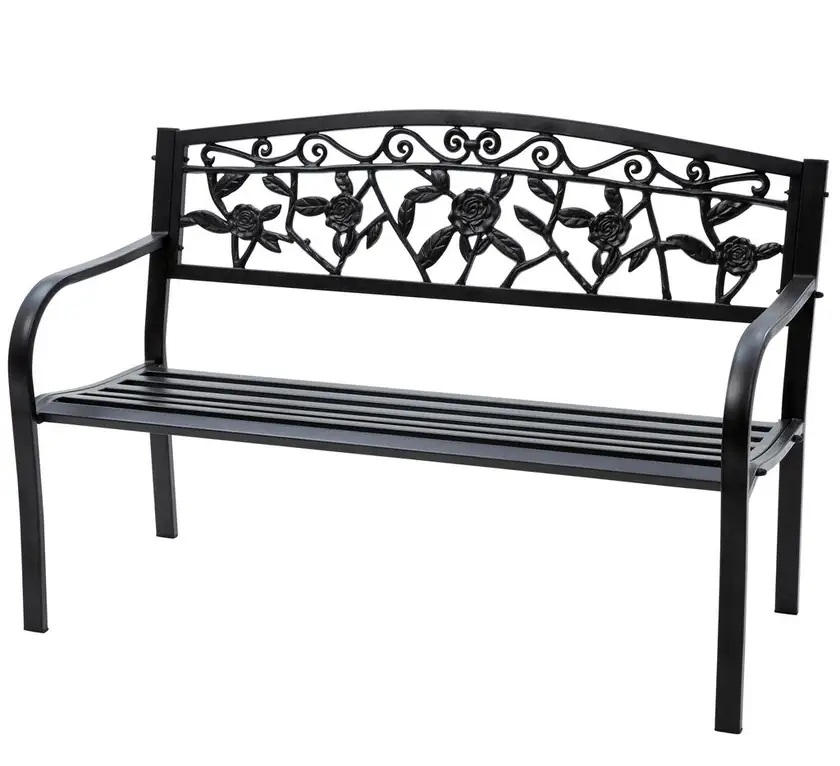 The Cornwell 2 Seater Steel Bench brings a touch of elegance to your garden or patio. Sleek black in colour, this bench stands out with a decorative back rest featuring embossed roses, leaves and swirls which complement the straight horizontal lines on the sitting area. Made from powder coated steel, this furniture is extremely durable and designed to last. This seat can fit up to two people and has a maximum load capacity of 200kg. It has a stackable design which allows you to easily store it away when not in use. A beautiful addition to any home, the Cornwell 2 Seater Steel Bench is quick and easy to assemble for added convenience.