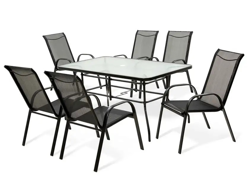 The Aiden 6 Seater Steel Dining Setting is the best choice for those looking for a modern outdoor dining setting. It has a modern black powder coated steel which is designed to be durable for outdoor use. The 5mm water wave tempered glass tabletop makes cleaning easier than ever, whilst making this dining set look sleek and refined. Each of the 6 chairs includes a black Texteline fabric sling, ensuring comfort and durability, whilst also making the chairs feel breathable, especially during humid weather. The chairs offer a weight capacity of 110kg, ensuring the chairs are sturdy and stable. Perfect for family barbecues, dinners and weekend breakfasts, the Aiden Dining Setting is a great option for your garden or verandah.