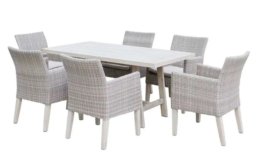 Includes 6 seats with a chair weight capacity is 150Kg; Table: H750 x W1600 x D790mm, Chair: H870 x W650 x D600mm; Solid FSC acacia timber table – sturdy and reliable; Whitewash brushed finish provides a modern flair; Weather-resistant wicker; Large comfortable classic-styled chairs with weather-resistant wicker and beige 50mm fade resistant olefin seat cushions