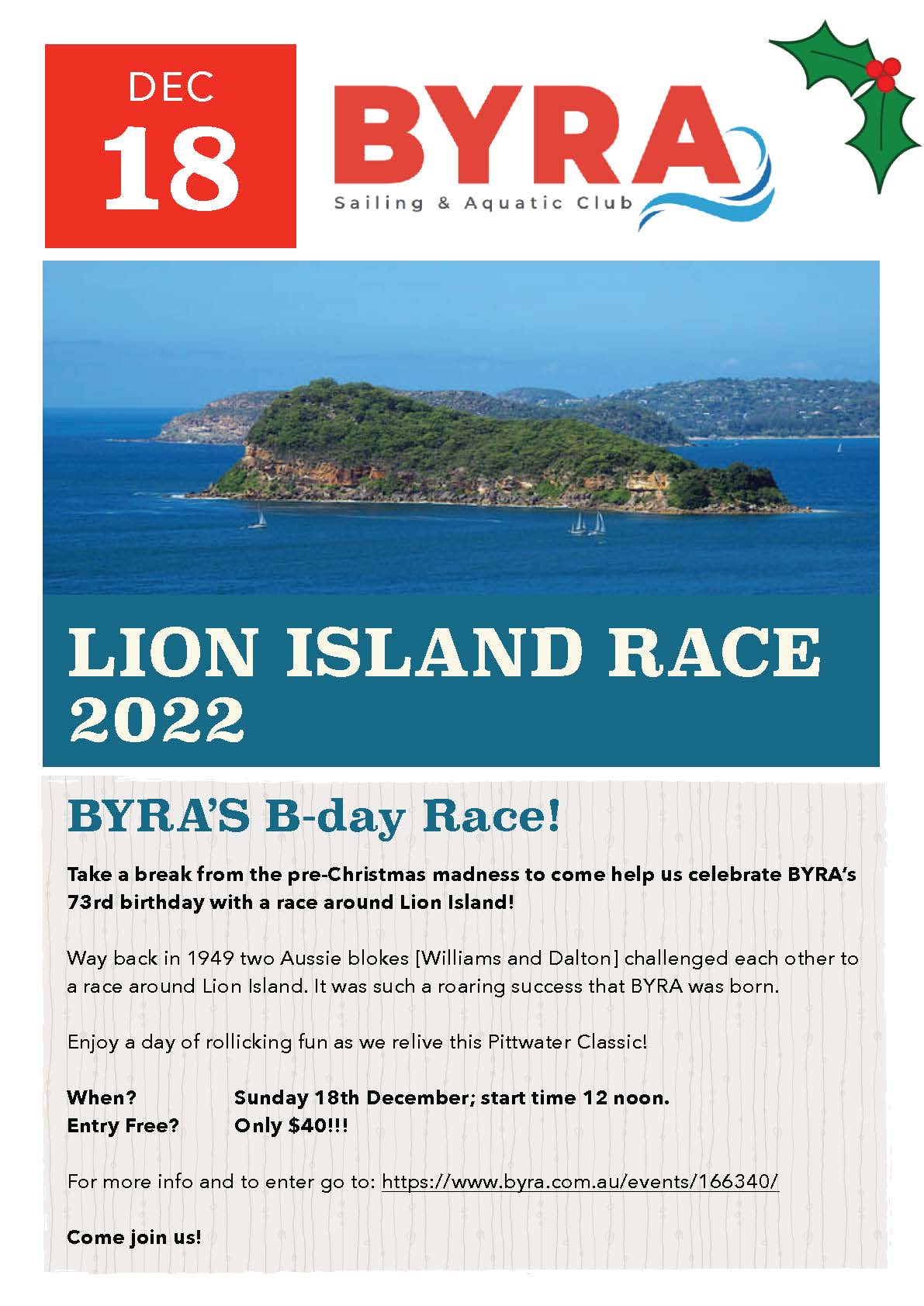 Way back in 1949 two Aussie blokes [Williams and Dalton] challenged each other toa race around Lion Island. It was such a roaring success that BYRA was born.