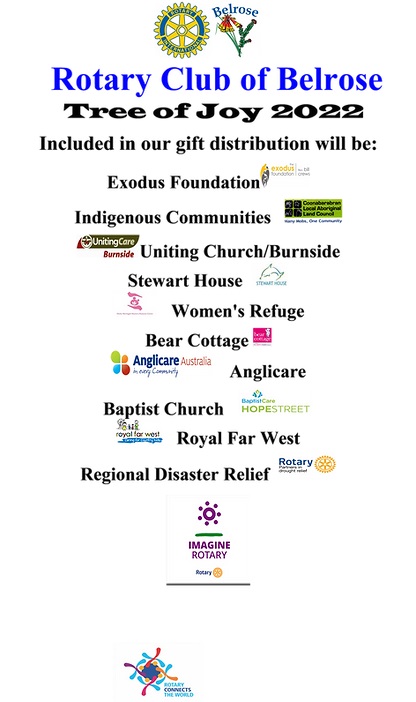 Trees of Joy are placed in shopping centres, banks, offices and the like. Some time before Xmas our Rotary Club contacts charities and welfare centres asking them what their requirements are. Once having received their requests appropriate labels are handwritten eg. "4 year old boy in hospital would like a transformer game".