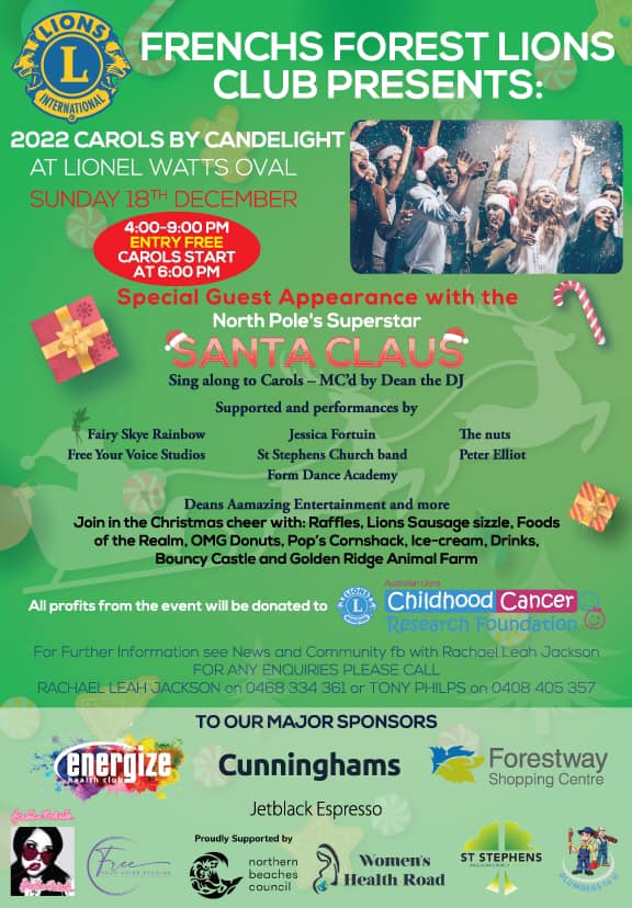 We are thrilled that Carols at the Beach are back after being cancelled for the last two years, and we welcome and thank our Platinum sponsor, McGrath Pittwater and Gold sponsor, Northern Beaches Council.