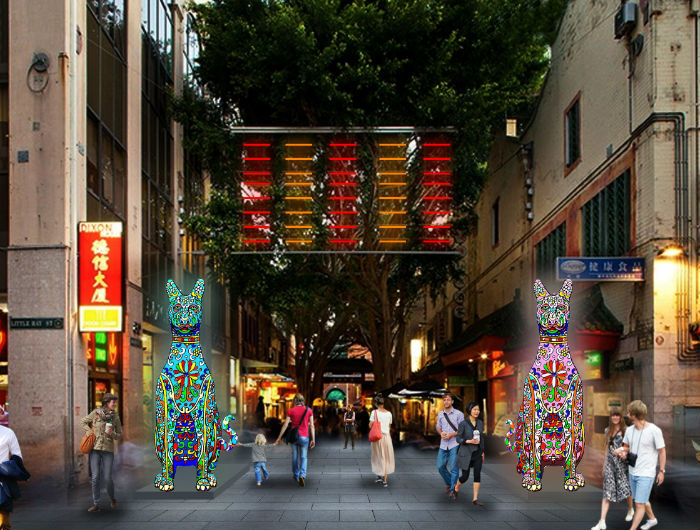 Chinatown will be watched by 2 guardian dogs towering 3.8 metres above the street. The pattern and colour of the red and blue dogs reflect the opposite qualities of yin and yang, as well as the happy, celebratory atmosphere of the Sydney Chinese New Year Festival.