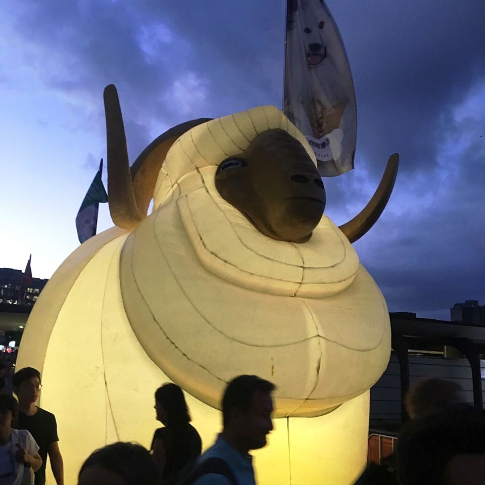 Mr Song created the fibreglass Dog lantern in memory of A-hei, giving it a wagging tail and a tongue that sticks out. It has been decorated with an inkwash paint finish, taking on traditional Chinese folk art colours and shape.