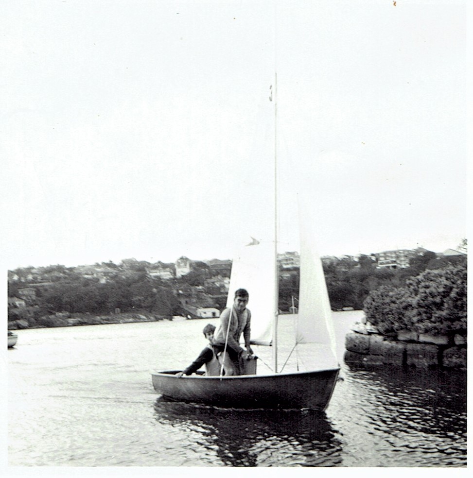 with son Mark in pram dinghy he built