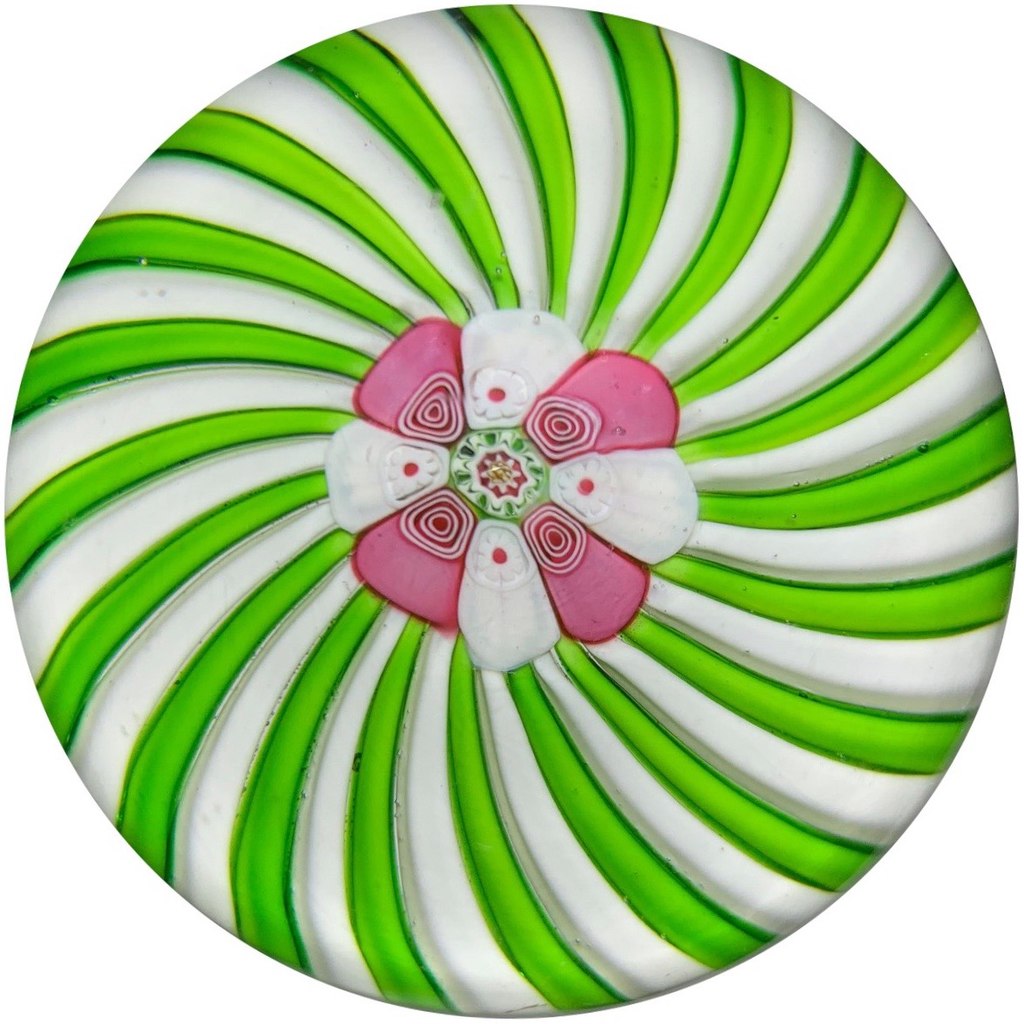 Antique Clichy Green & White Swirl Paperweight With Large Millefiori Center. Made in France in the Mid 1800s.