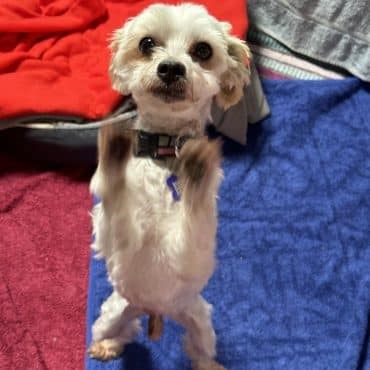 Pete is a delightful very gentle sweet natured boy. He is social with other dogs and easy to pick up and cuddle. Pete came from the pound with terrible dental disease and dull dirty coat. He has had a bath and clip and had 7 teeth extracted. He will now be able to enjoy his cooked chicken more. He is currently on 2 feeds a day as he is still underweight. Out walking Pete will pull on lead and is reactive past other dogs. He has a non-shedding coat and came from the pound weighing 3.5kg