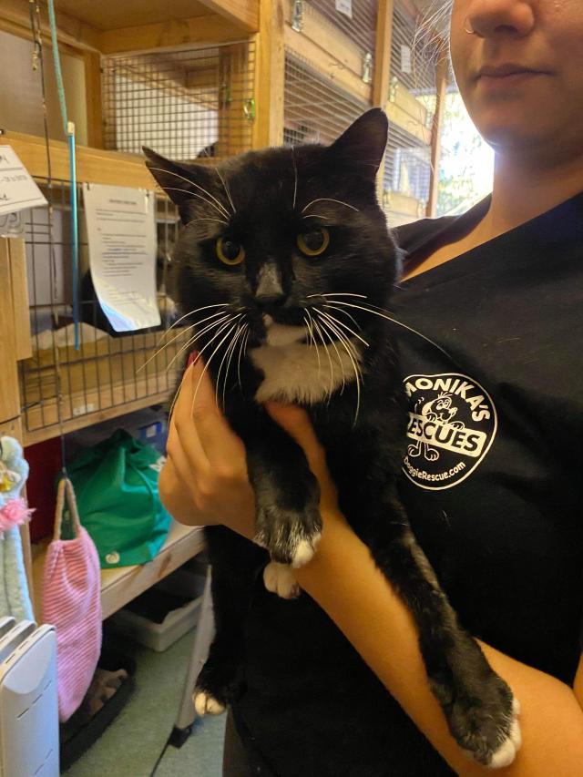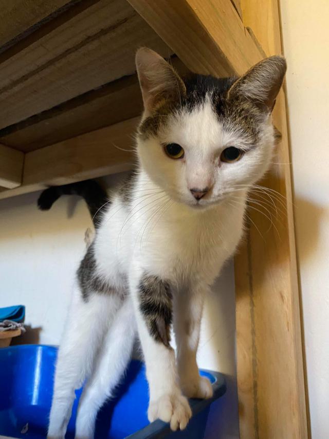 Taz is an affectionate black and white short haired boy who weighs 4.4kg, and is approximately 2 years old. He is currently recovering well from bite wounds from his recent street cat days. He is amazingly smoochy and cuddly! He comes desexed, wormed, F3 vaccinated, FIV/FeLV tested (FIV positive) and microchipped. His adoption fee is $220.