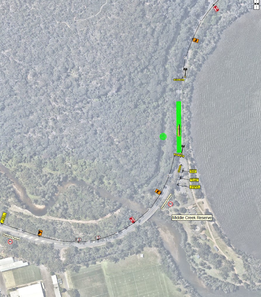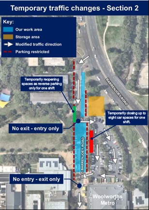 - one-way traffic (southbound) with traffic diverted through the Woolworths car park (see ‘Temporary traffic – Section 2’ map below).